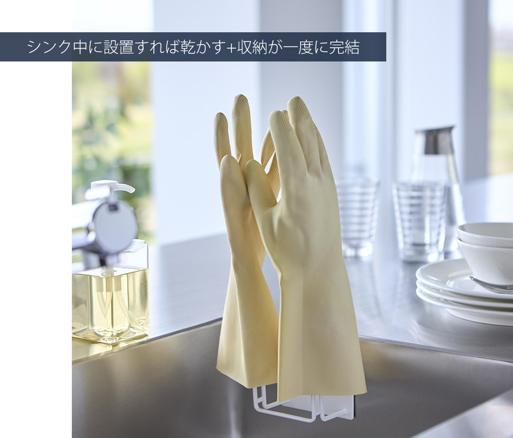 ホルダー部分は細長く設計されていて、一般的なゴム手袋の指の先端までしっかり入ります。きちんとゴム手袋を伸ばした状態で乾燥と収納ができます。