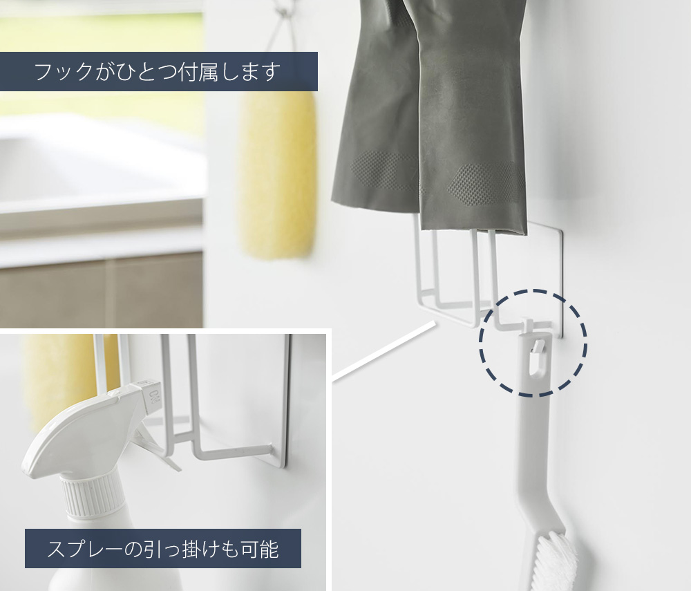 ホルダーに取り付けできる可動式のフックが1つ付属するのでお掃除ブラシなどを引っ掛けられます。また、ホルダーの下部分にはスプレーなどを引っ掛けて収納もできます。