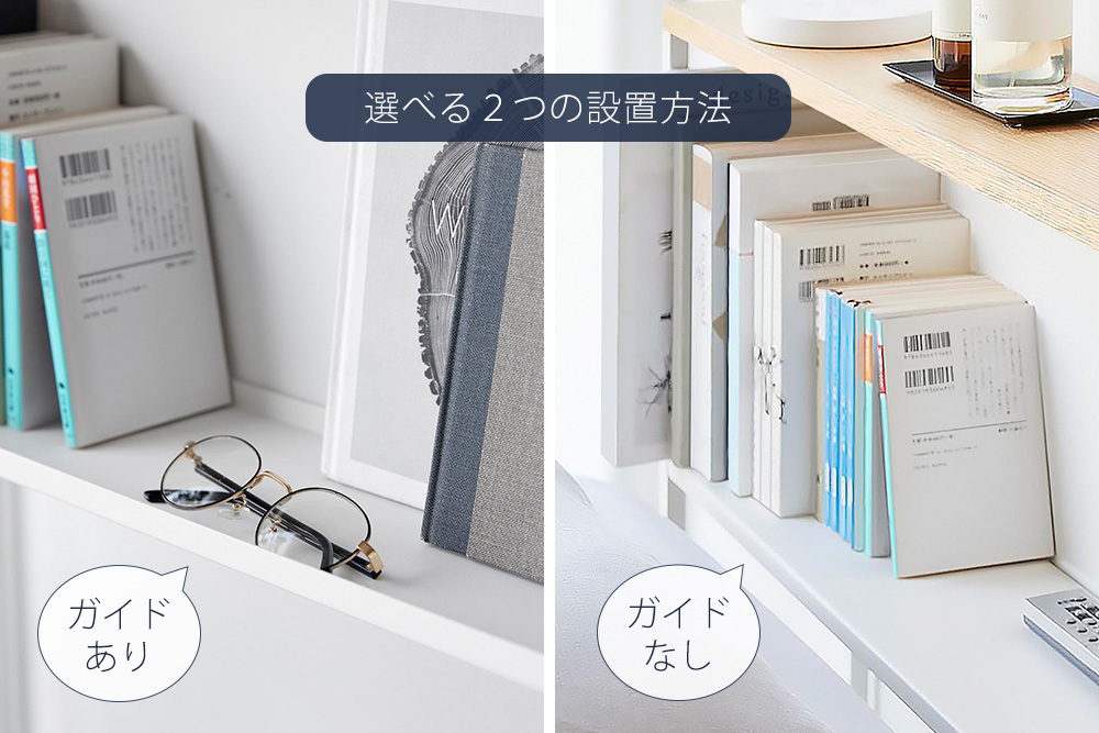 棚板を裏返すことで、物が落ちにくいガイドあり、大きめの物も置けるガイドなしの、2つの収納方法をお選び頂けます。