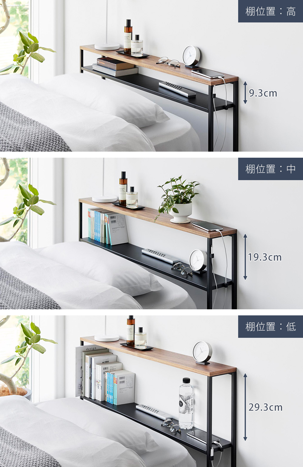 ご使用のベッドに合わせて棚板の高さを3段階で調整することができます。