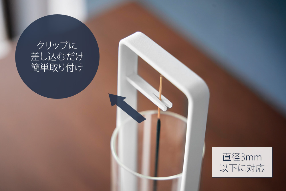 お香の差し込み部分はクリップ状になっていて、直径3mm以下のスティックタイプのお香を取り付けできます。