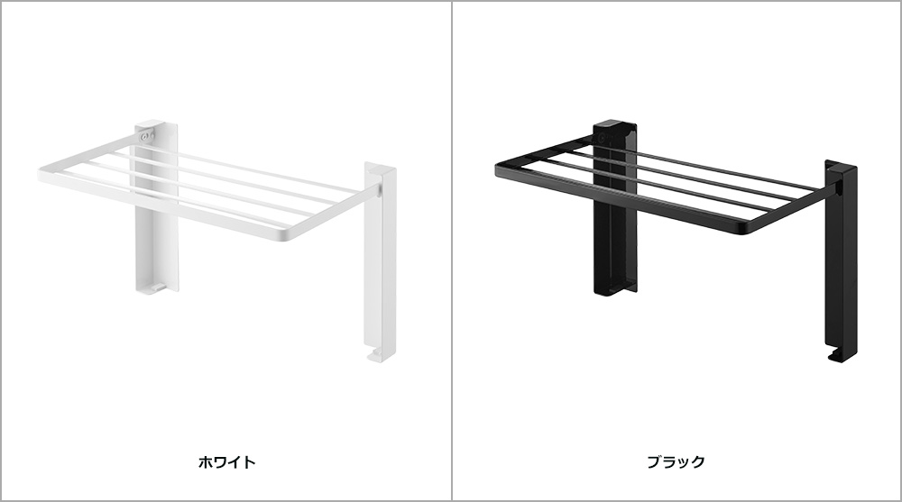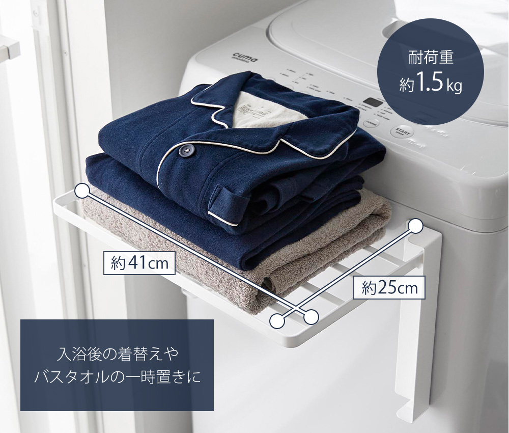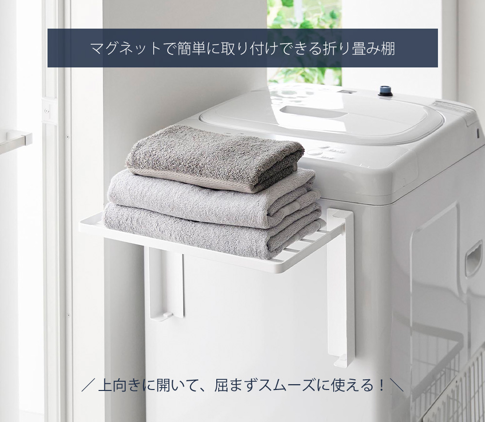 マグネットですぐに取り付けられる、バスタオルや着替えなどの一時置きに便利な折り畳み棚。上向きに開く仕様で、屈まずに使えるちょうど良い高さです。表面に光沢感があるフレームで、清潔感のあるデザインです。