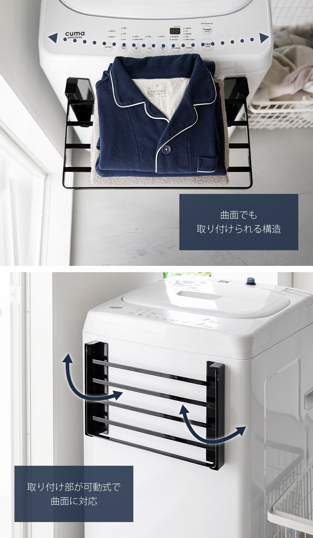 正面や側面がまっすぐでない、曲面の洗濯機にも取り付けられます。洗濯機の形によって取り付けを諦めていた方にも、お使いいただける構造です。