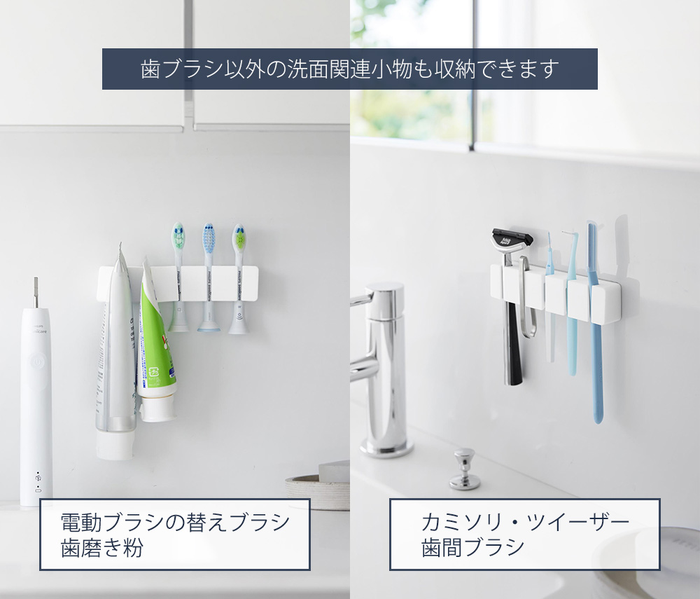 歯ブラシ以外にも電動歯ブラシの替えブラシや、カミソリ、ティーザー、歯間ブラシなど洗面・歯磨き関連の小物を収納できます。