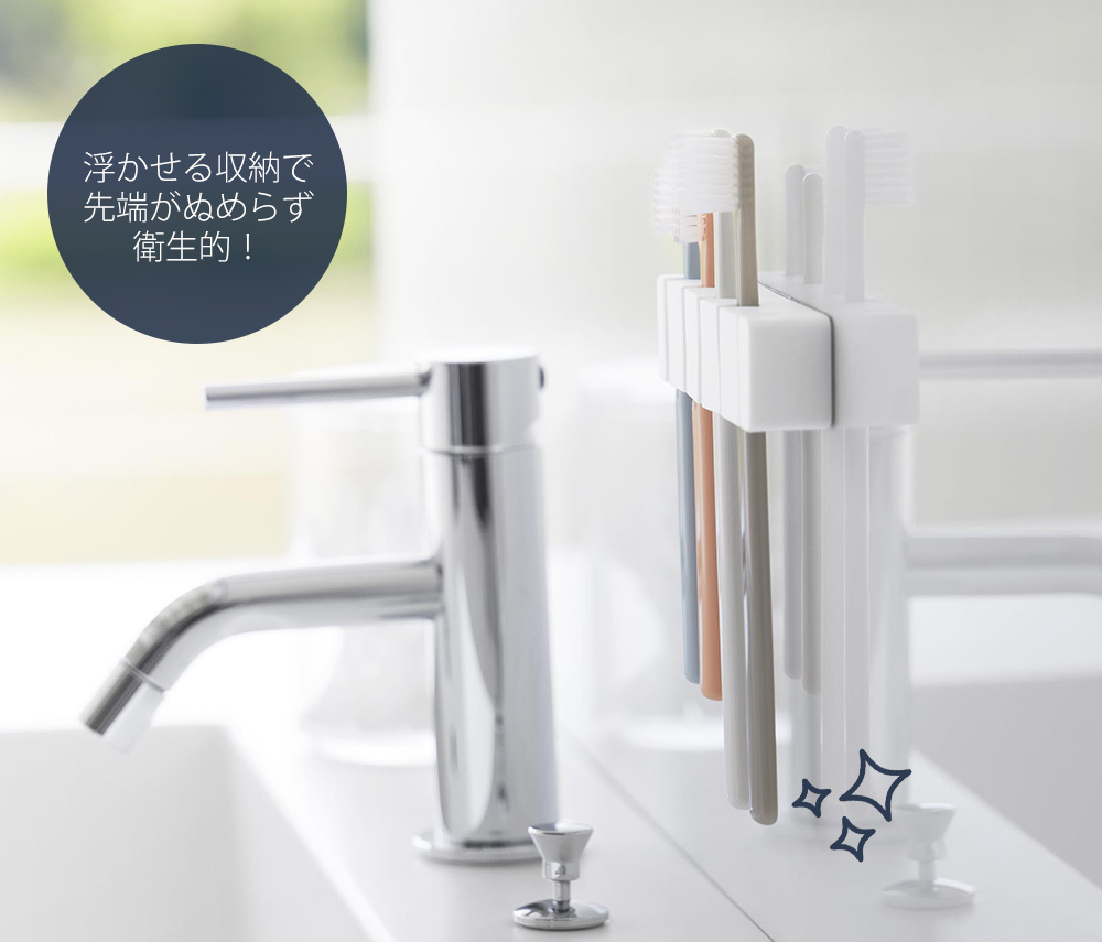 洗面台奥の壁やお風呂のタイル壁が歯ブラシ収納に早変わり。設置も歯ブラシ収納も簡単な歯ブラシホルダーです。ご家族で使える5連タイプ。