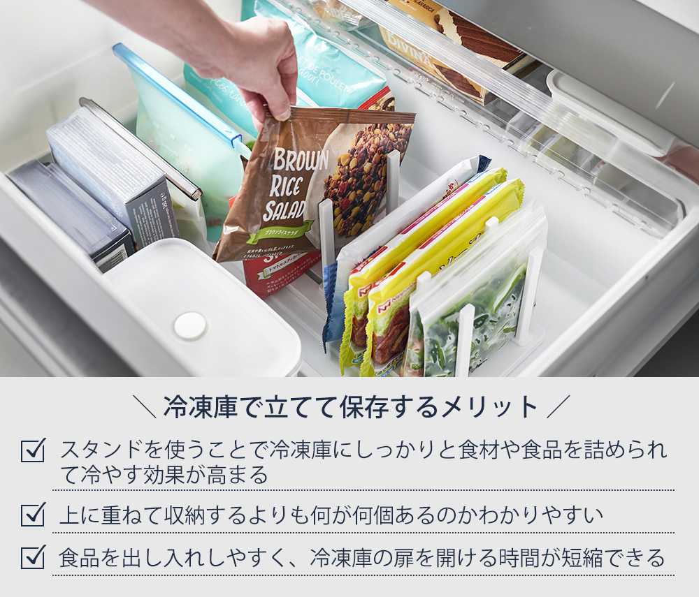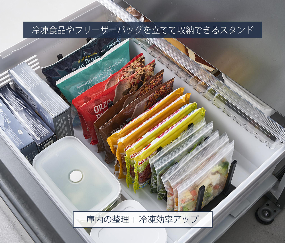 冷凍食品や食材をまとめ買いしたけど、庫内がごちゃごちゃしていて見づらいし出し入れしにくい…そんな冷凍庫内をすっきり整頓できる収納スタンドが登場!立てて収納することで見やすくなり、冷凍効率もアップします。