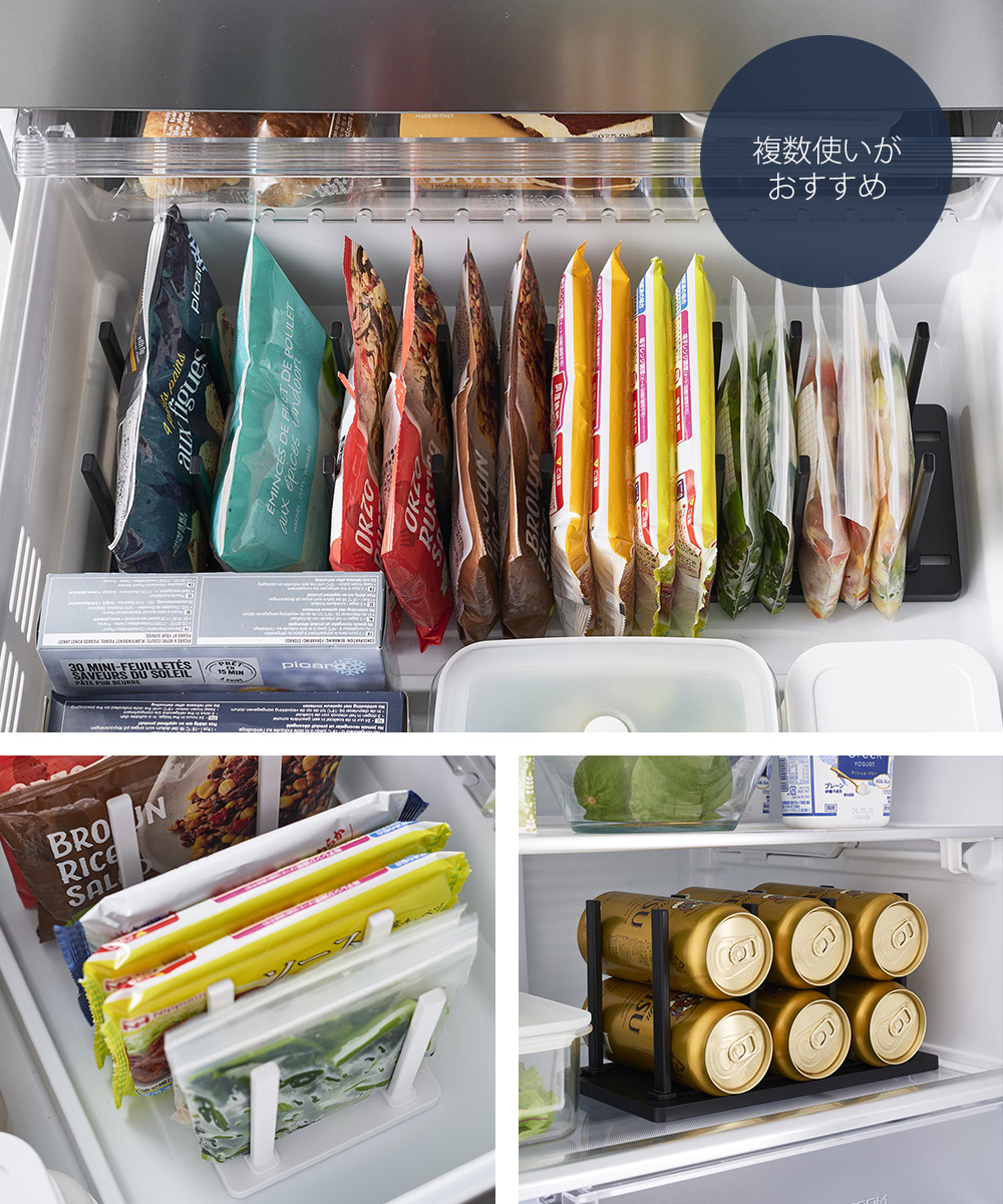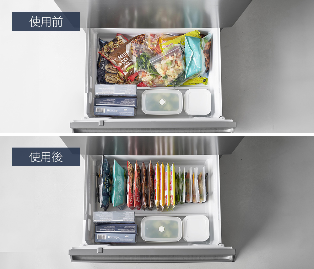 引き出しタイプの冷凍庫や、セカンド冷凍庫でも使用可能です。奥まで食材や冷凍食品が倒さず収納できるので、中身の確認がしやすくなります。
