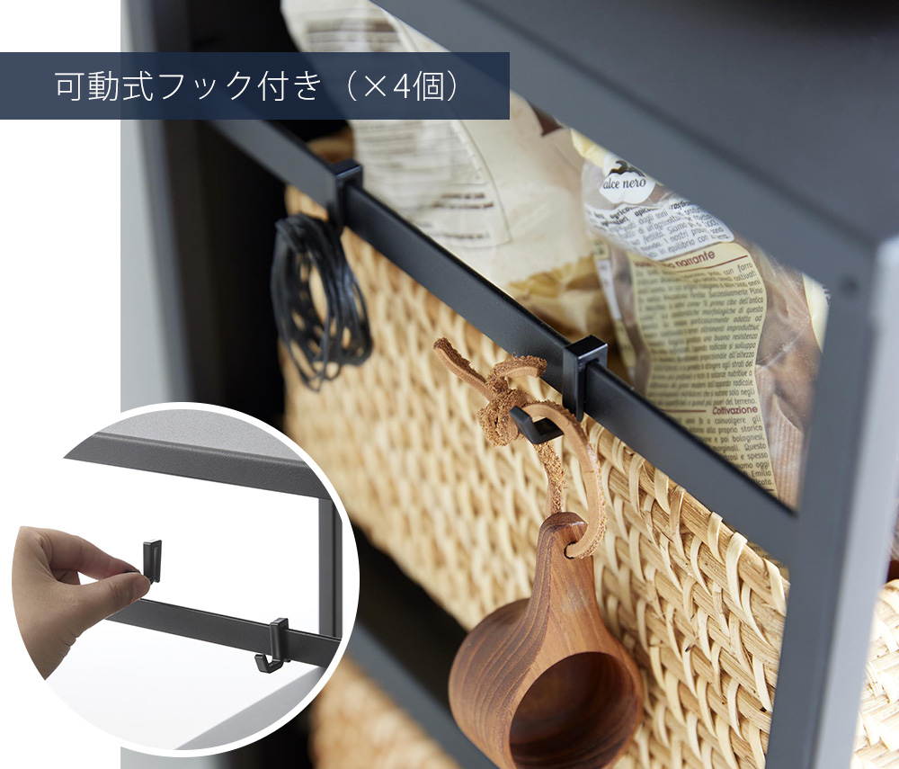 ワゴンのサイドの好きな場所に取付できる可動式のフックが4つ付属します。小物を引っ掛ければさらに収納力アップ。