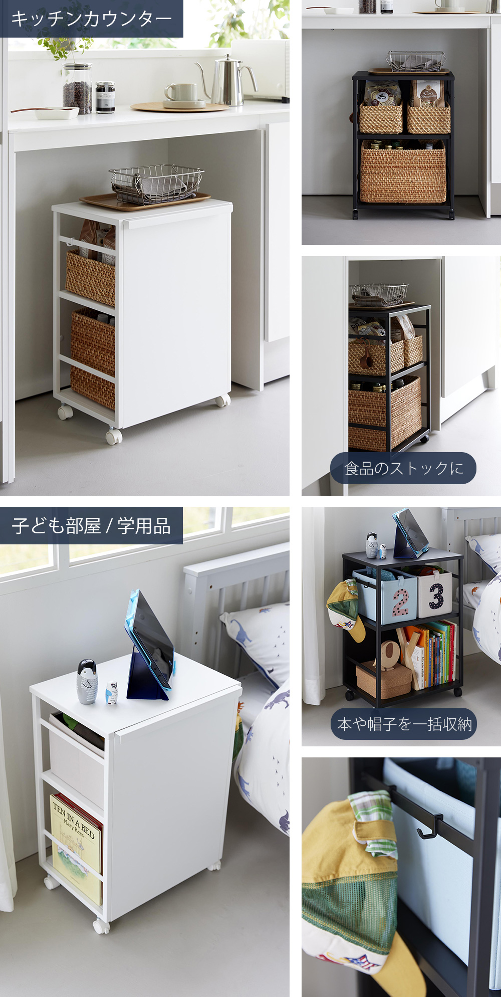 食品類やペット用品、お子様の学用品まで様々な物をストックできるワゴン