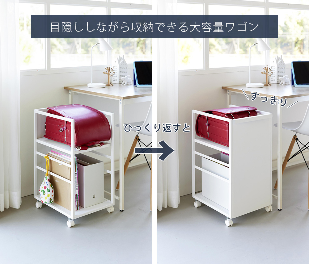 たっぷり収納して、見せたくないものはひっくり返してすっきり目隠し!子供部屋からリビング、書斎やオフィス、キッチンなど色々な場所で活躍する大容量ワゴンです。