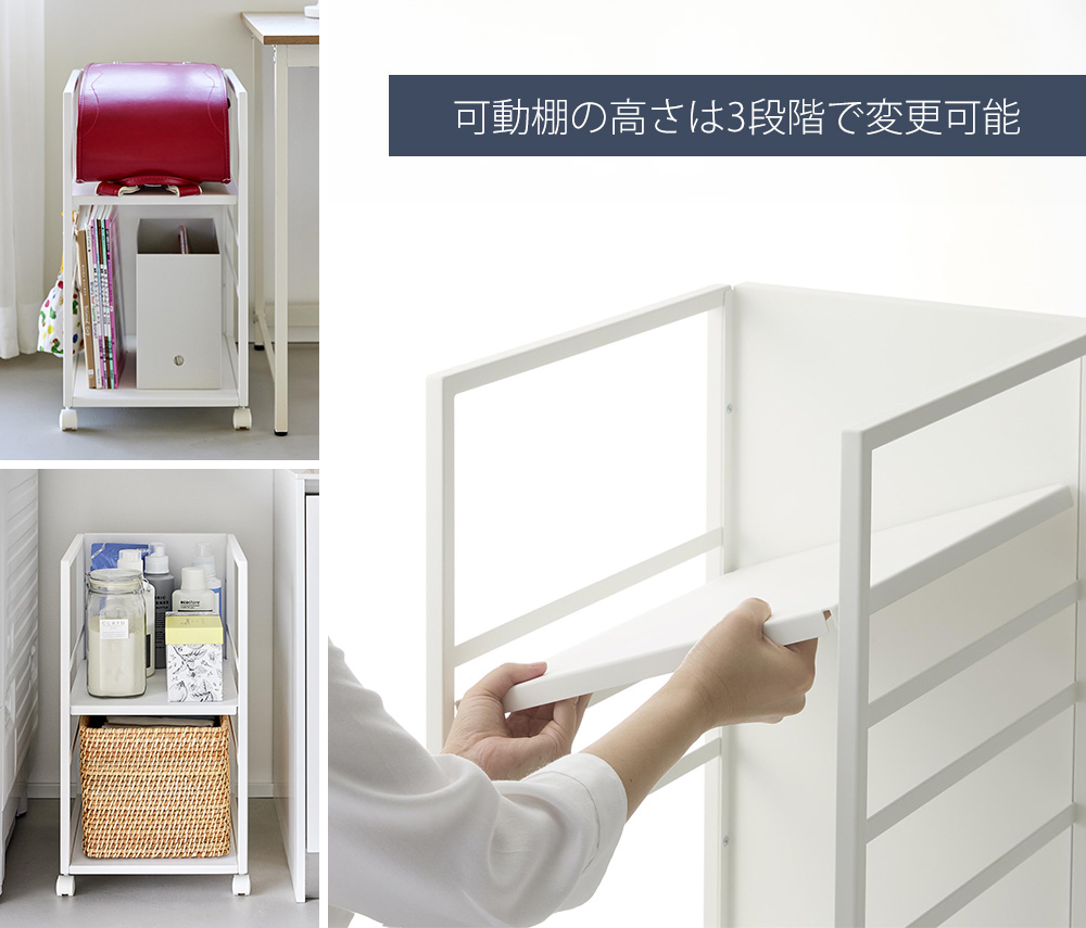 可動棚は収納するものの高さに合わせて3段階調節が可能です。可動棚はフレームに引っ掛けるだけで設置できるので、収納したいものが変わったときもすぐに高さの変更ができます。
