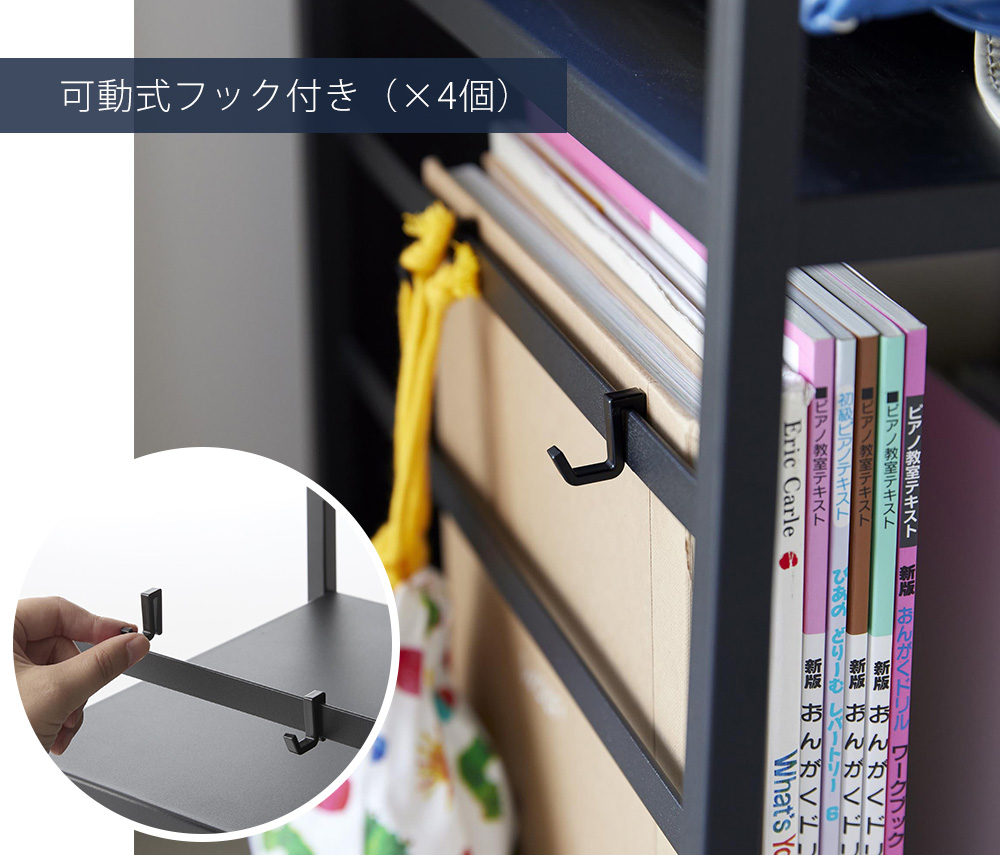 ワゴンのサイドの好きな場所に取付できる可動式のフックが4つ付属します。小物を引っ掛ければさらに収納力アップ。