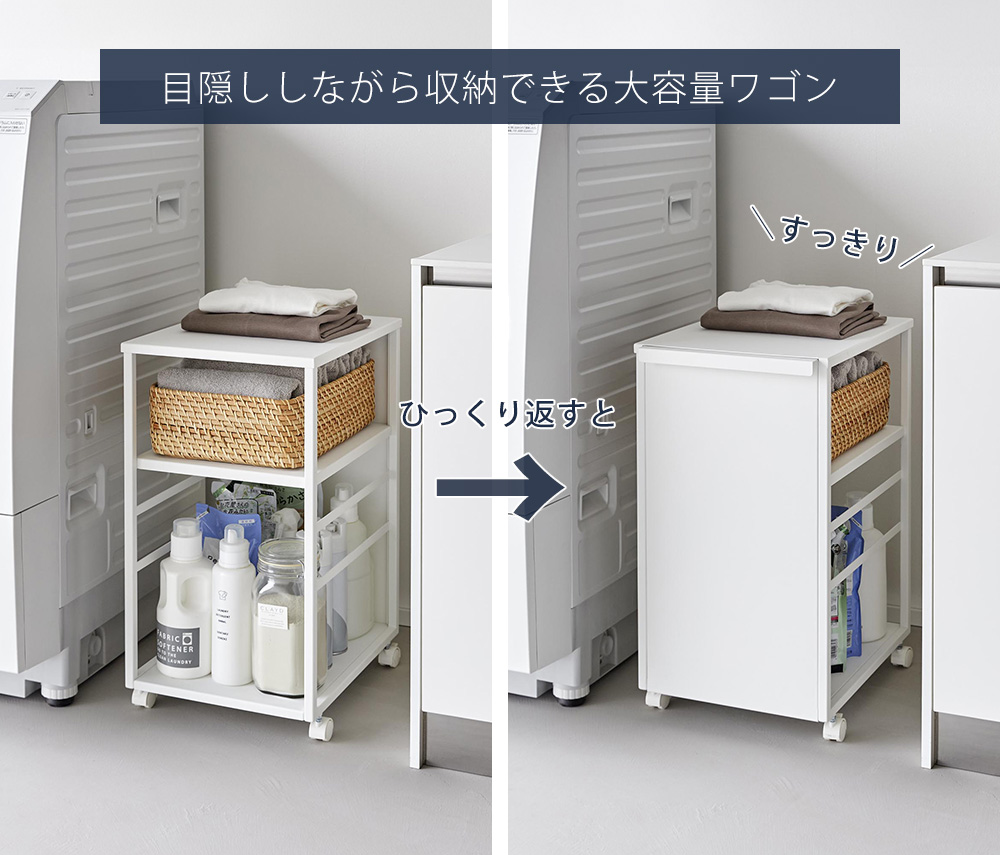 たっぷり収納して、見せたくないものはひっくり返してすっきり目隠し!子供部屋からリビング、書斎やオフィス、キッチンなど色々な場所で活躍する大容量ワゴンです。