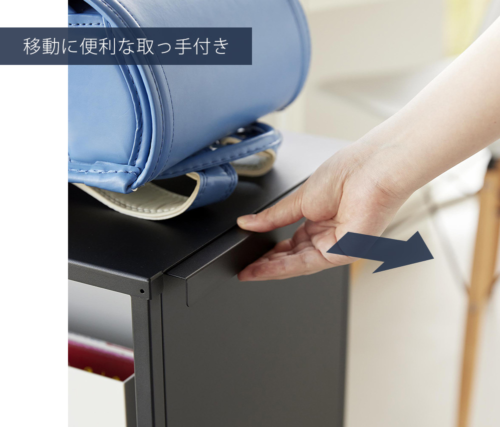ランドセルや図鑑、家電、食品のストックなどの重さがあり、大きくてかさばる物や背の高いものをたっぷり収納。耐荷重はそれぞれ天板が約7.5kg、可動棚が約10kg、下(底)段約15kgあるので、重さを気にせず収納できます。