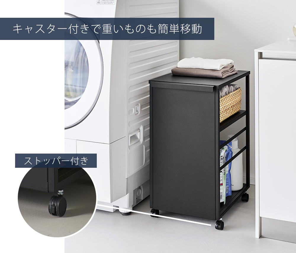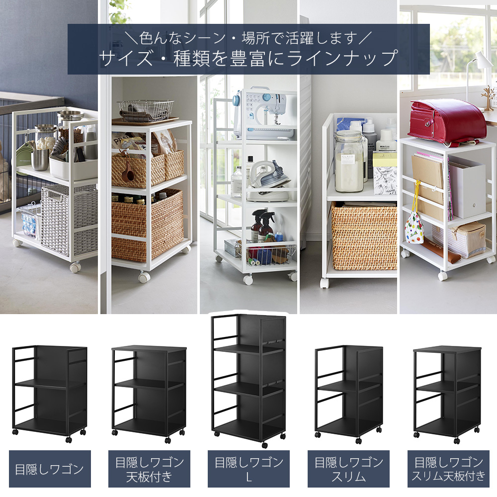 大人気towerの目隠しワゴンから、横幅を抑えたスリムで付け外しが可能な天板付きタイプが仲間入り。天板も収納として使えるので、小物のディスプレイや一時置きなどに活躍します。