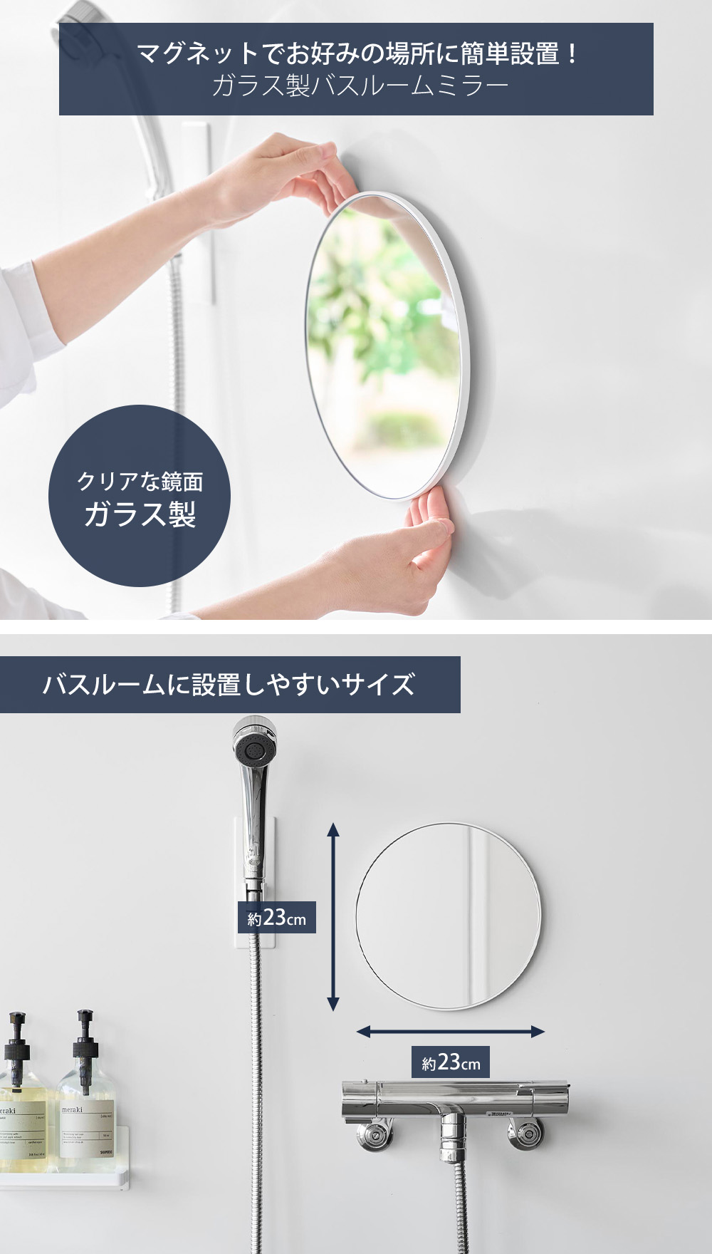 >> マグネットバスルームミラー 丸型 23cm | >> マグネットバスルームミラー 丸型 42cm | |