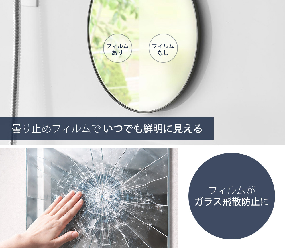 鏡面に曇り止めフィルムを粘着加工しているので、シャワー中の気になる曇りを防ぐことができます。