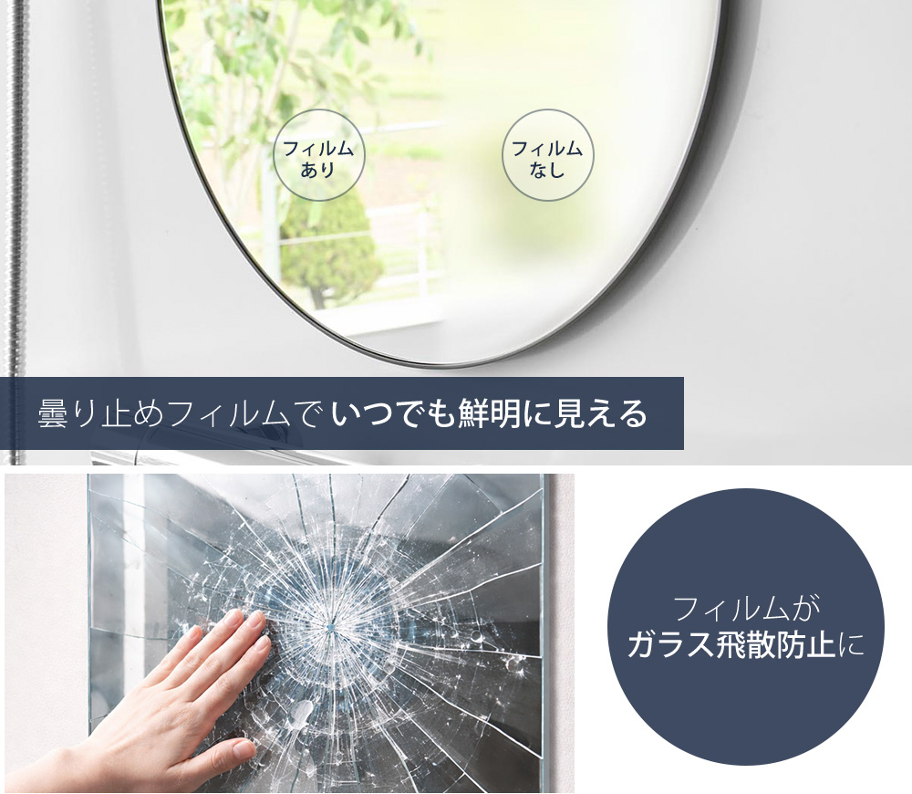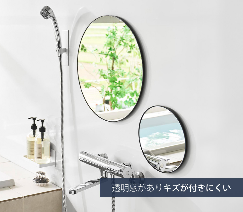鏡面に曇り止めフィルムを粘着加工しているので、シャワー中の気になる曇りを防ぐことができます。