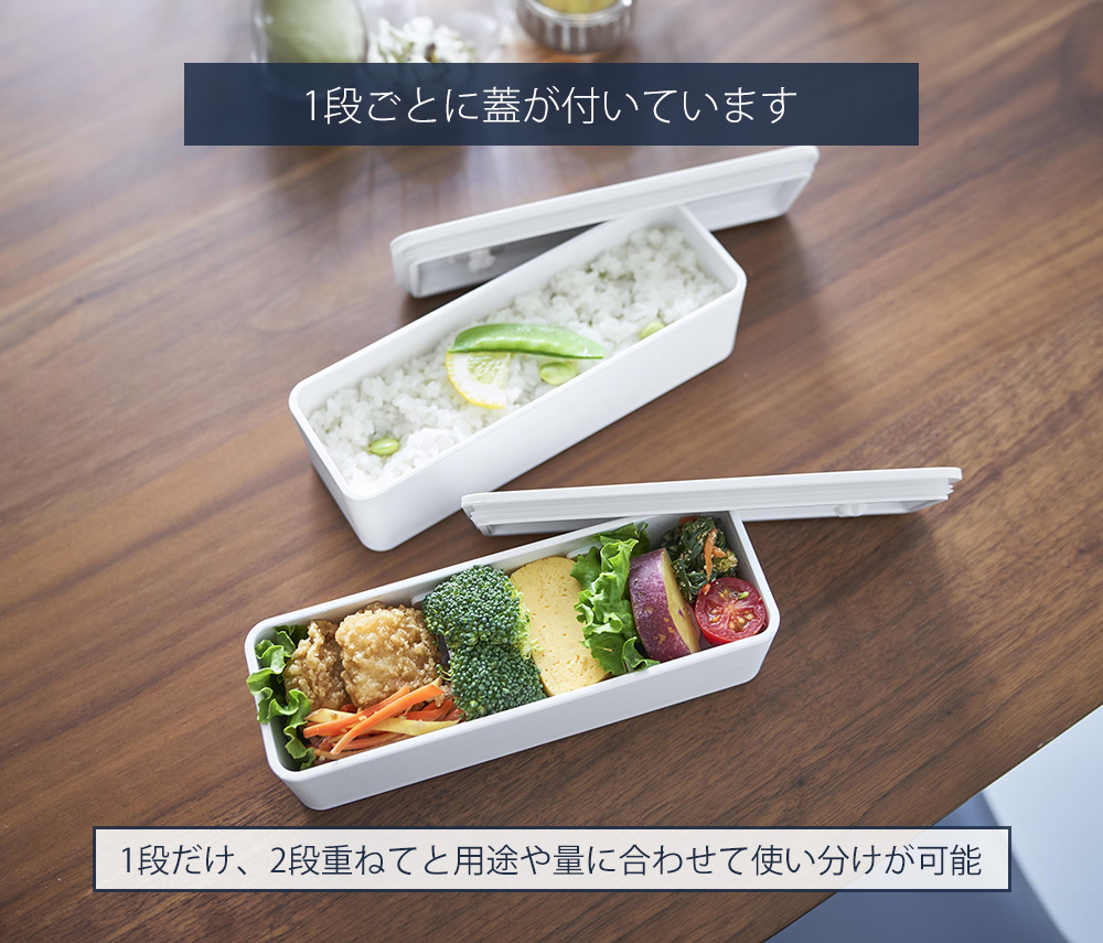 1段ずつ蓋が付いているので2段重ねるのはもちろん、1段だけ使用したり、二人でシェアしながら使うこともできます。