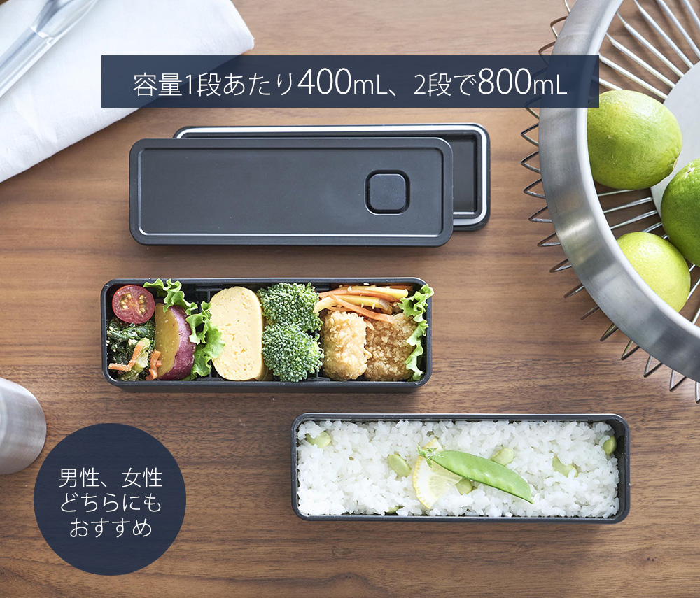 容量は1段あたり約400mlで、2段合わせると800mlの大容量。たっぷり食べたい人は2段使用、小食の方や食事量を控えている人は1段使用と使い分けができて、男性・女性どちらにおすすめです。