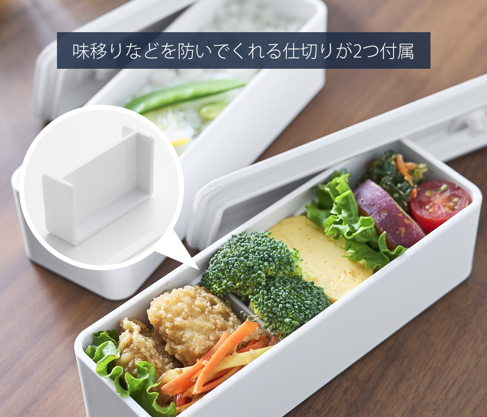 味移りなどを防いでくれる仕切りが2つ付属。(1段に1つ付属します)付属の仕切りは移動させることができるので、好きな場所で区切ることができます。