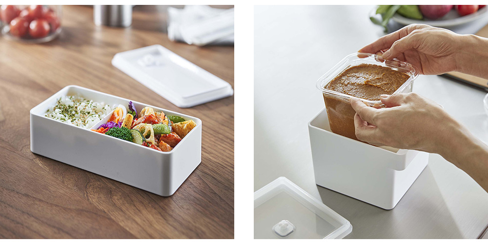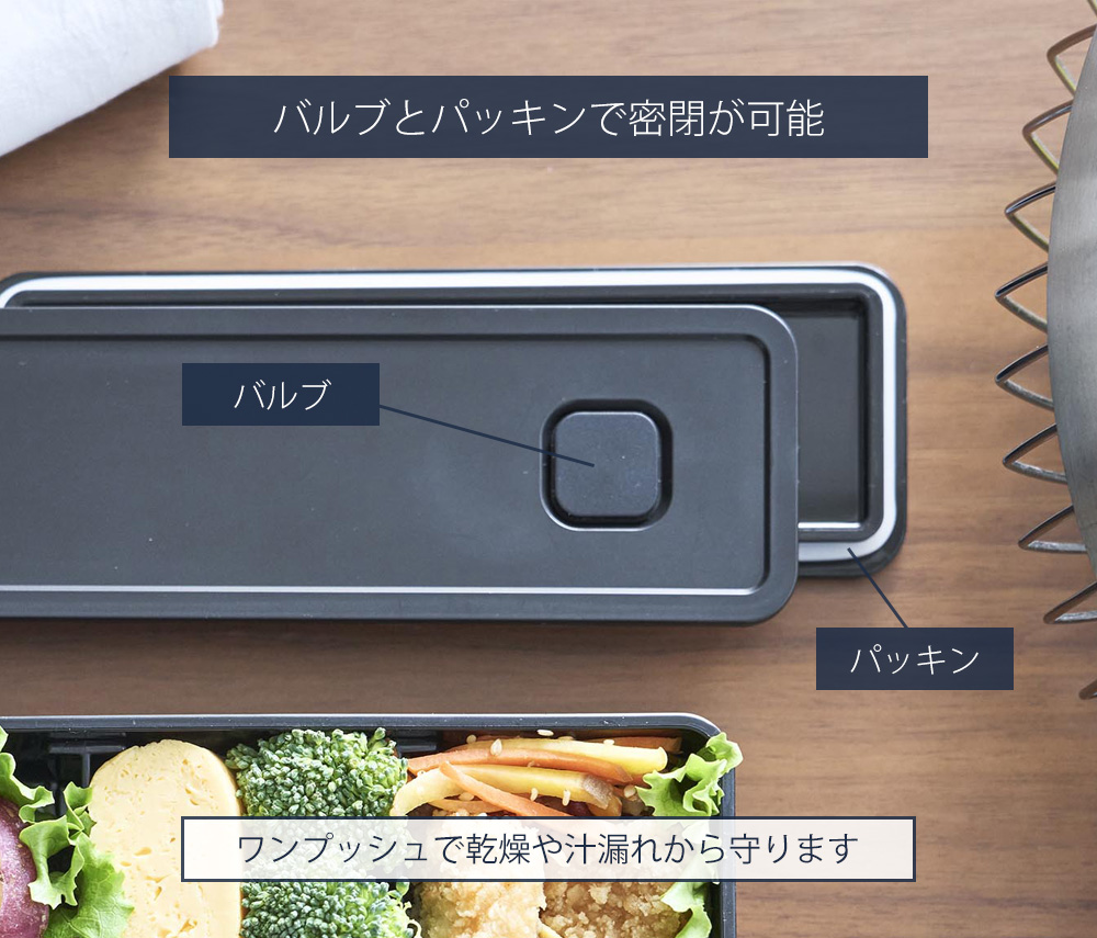 蓋はワンプッシュで簡単密閉できるバルブとパッキン付き。冷蔵庫の中での乾燥や、持ち運びの際の汁漏れ・匂い漏れを防ぎます。お弁当箱としてだけではなく、食材の保存にも便利です。