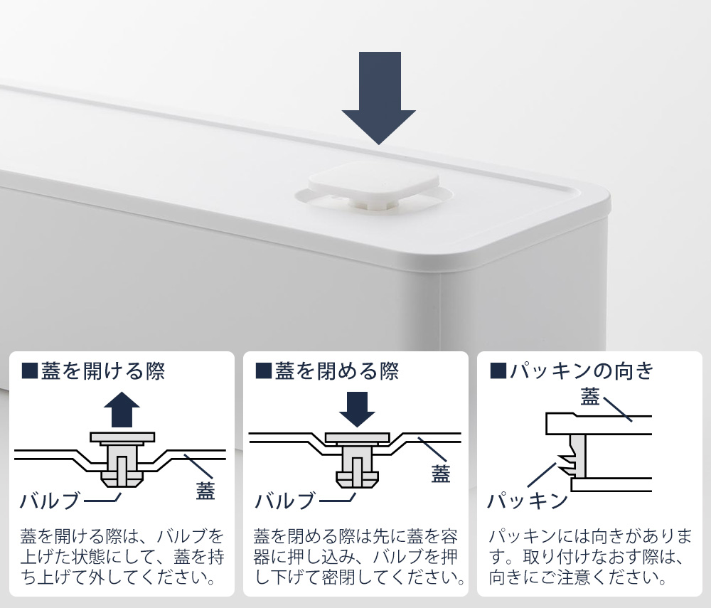 蓋を閉める際・・・蓋を閉める際は先に蓋を容器に押し込み、バルブを押し下げて密閉してください。