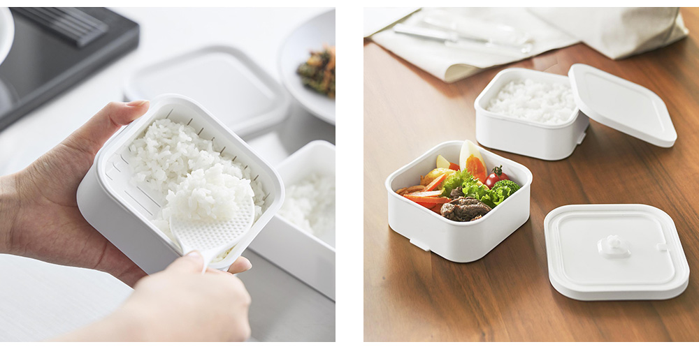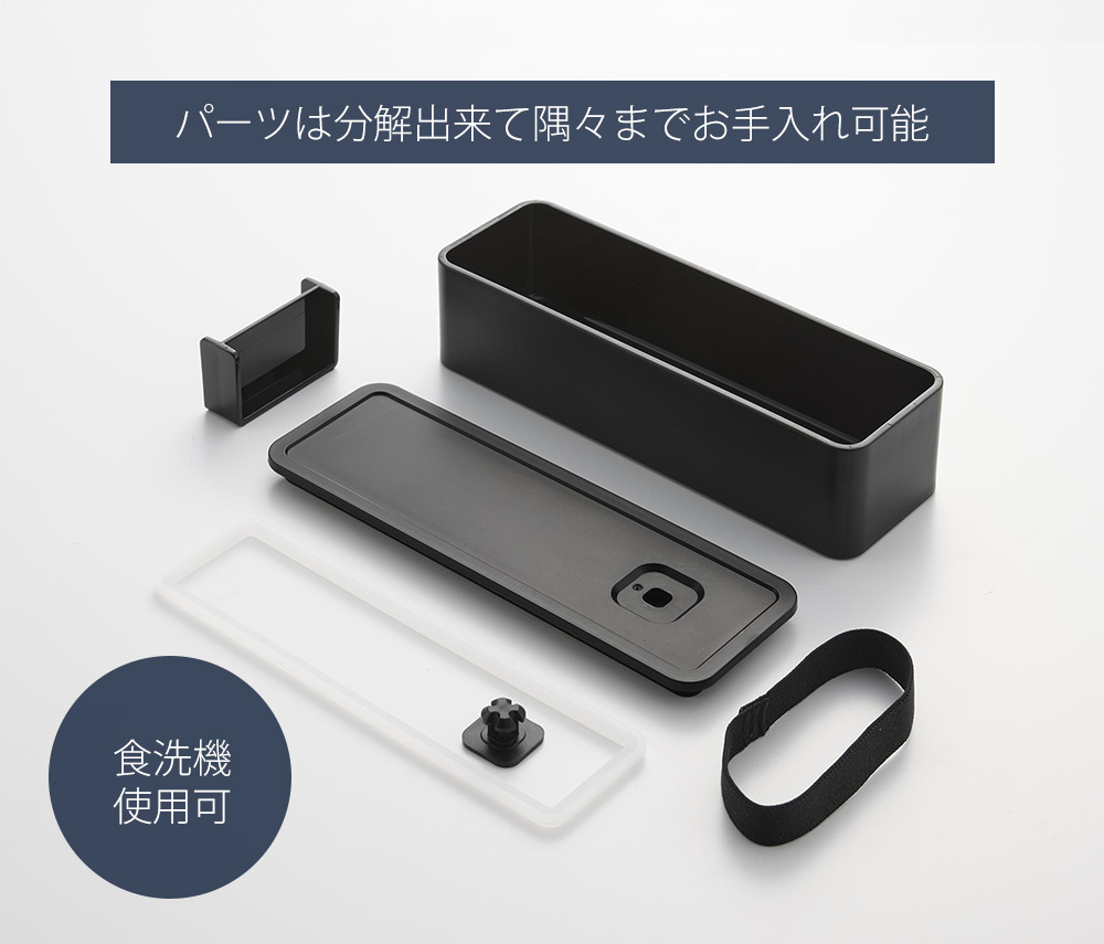 ランチボックスは幅がスリムで複数持ち運ぶときや、食器棚、冷蔵庫などに収納する際にスペースをとりません。容器と同色の専用のゴムバンドが付属します。