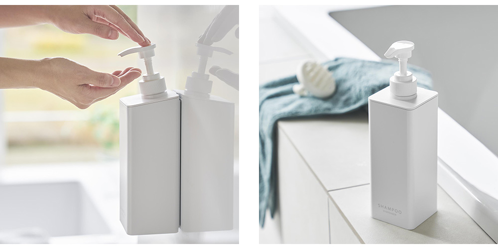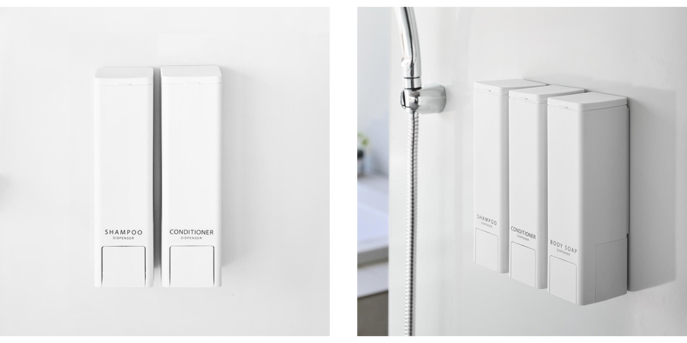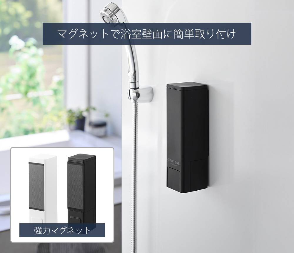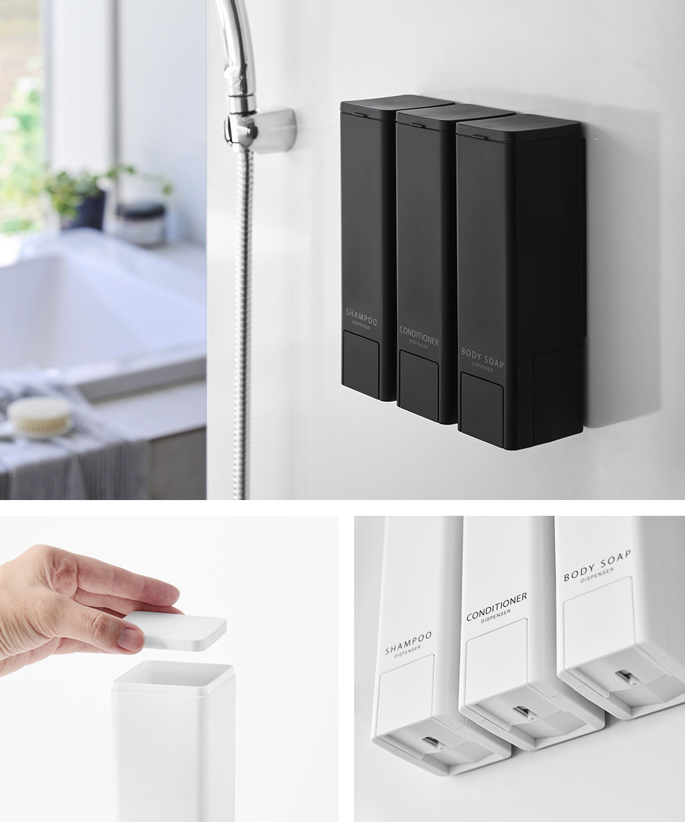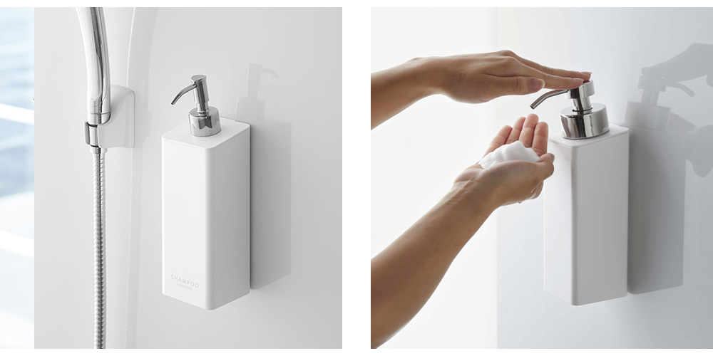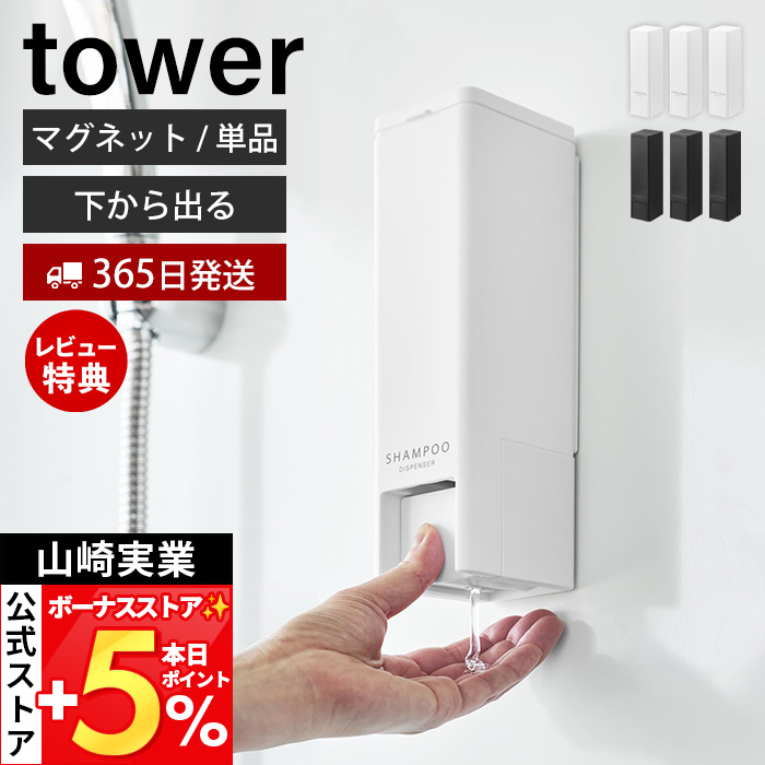 人気のtowerマグネットディスペンサーに下からシャンプーなどを出せる新しいタイプが登場しました。壁に設置したまま片手でプッシュができます。