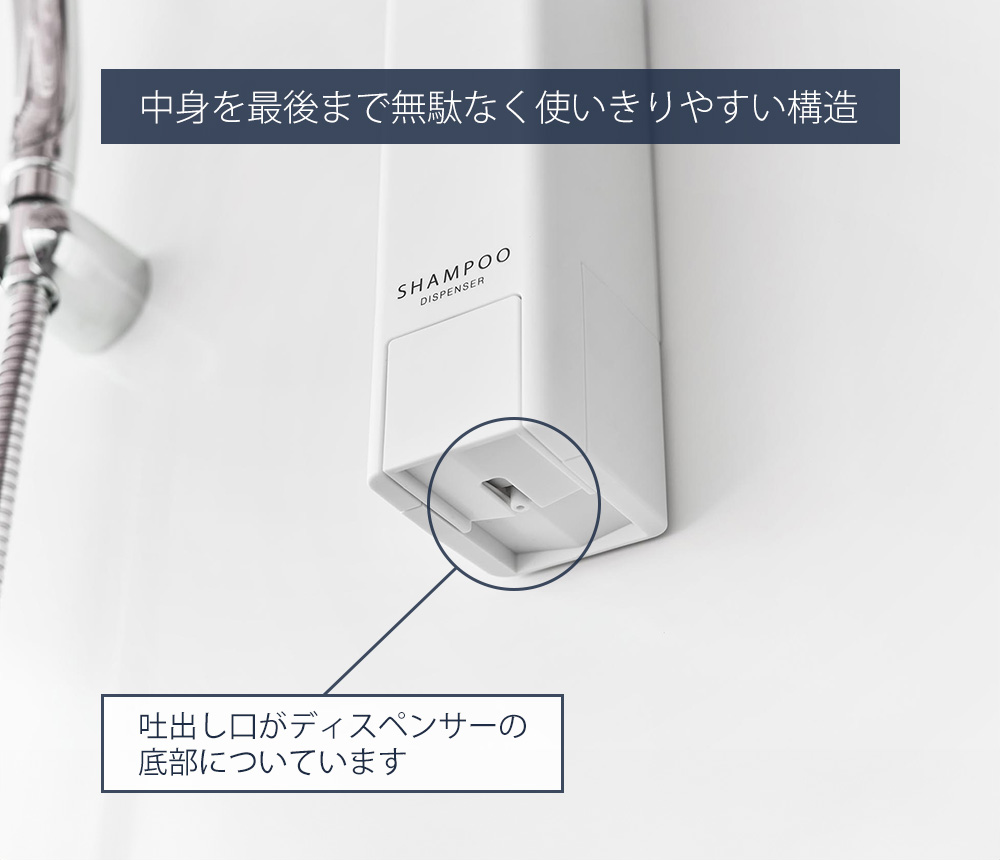 吐出し口がディスペンサーの底についていて、中身を最後まで無駄なく使い切りやすい構造です。上部でプッシュするタイプよりノズルへの液だれを気にしなくてもよく、ディスペンサー本体への内容物の付着が減り、清潔を保ちやすいです。