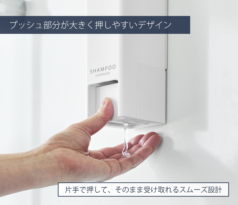 プッシュ部分が大きく、押しやすいデザインです。押す・受け取るが片手で完結するので、もう一方の手がふさがりがちなバスシーンでもストレスなく使えます。