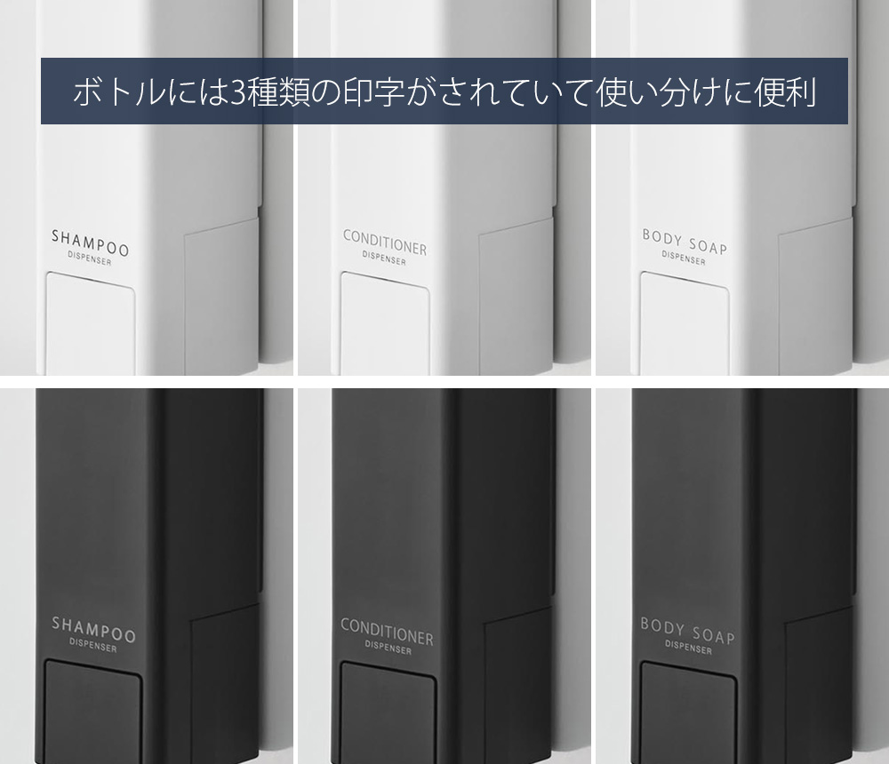 ボトルにはシャンプー(SHAMPOO)/コンディショナー(CONDITIONER)/ボディソープ(BODY SOAP)の印字がされているので使い分けに便利です。用途に合わせてそれぞれご購入いただけます。