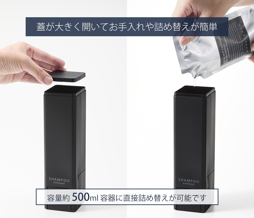 蓋が大きく開くのでお手入れや詰め替えが簡単です。容量は約500mLと、一般的な詰め替え用パウチ一袋分が入ります。