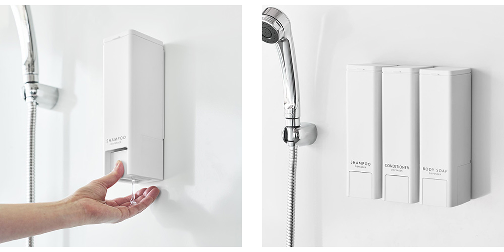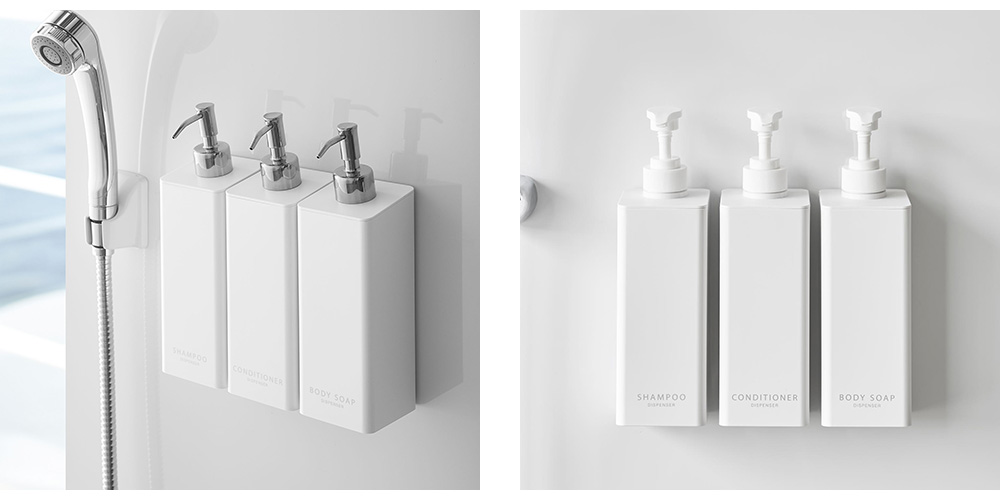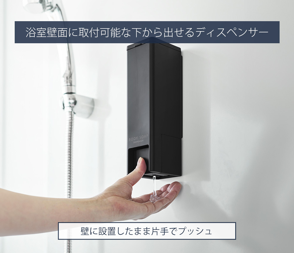 人気のtowerマグネットディスペンサーに下からシャンプーなどを出せる新しいタイプが登場しました。壁に設置したまま片手でプッシュができます。