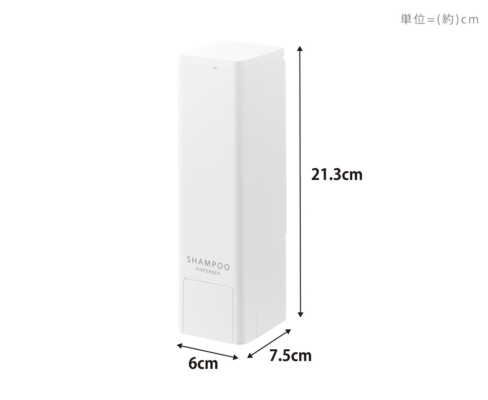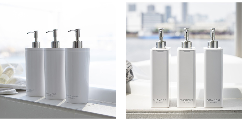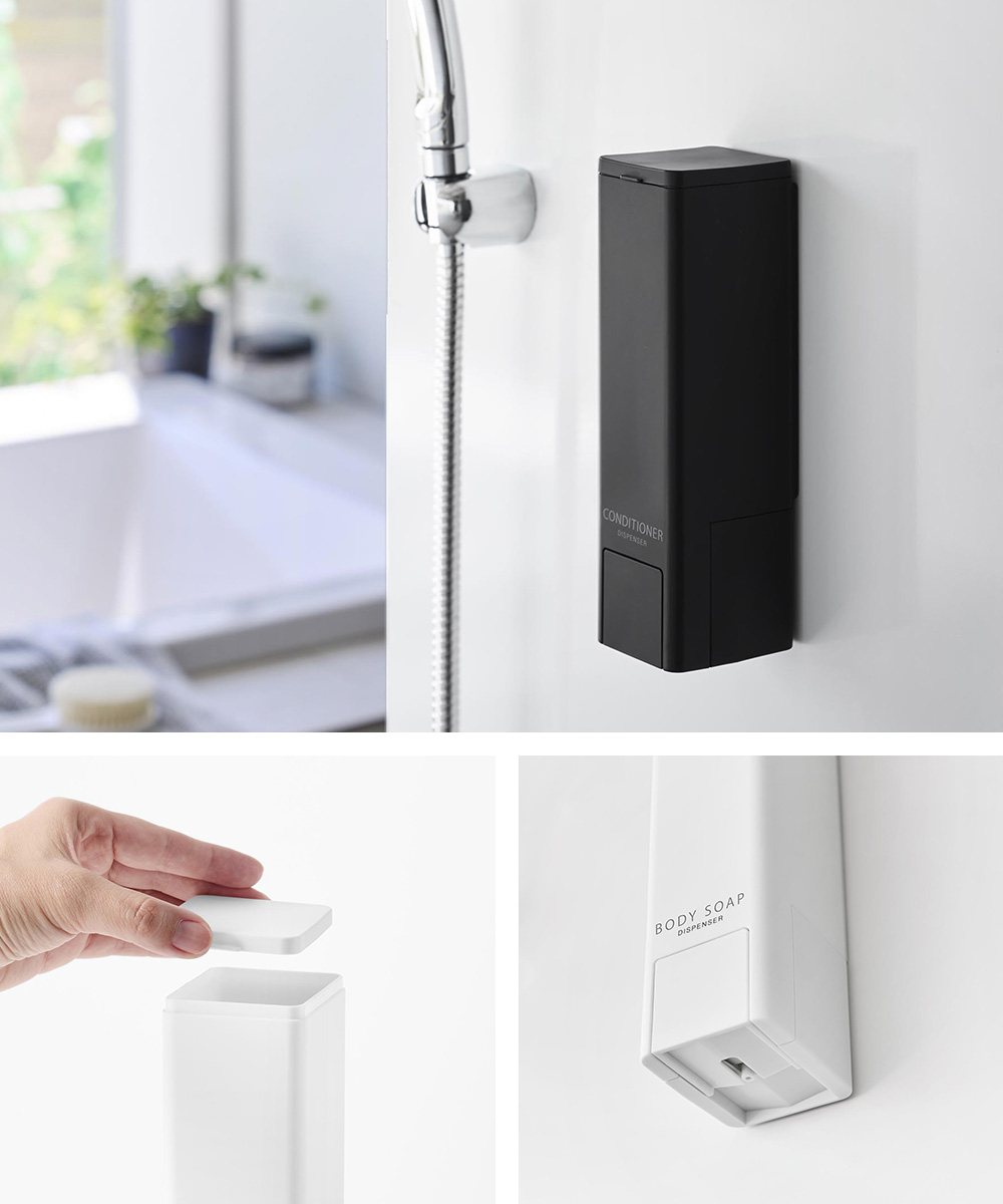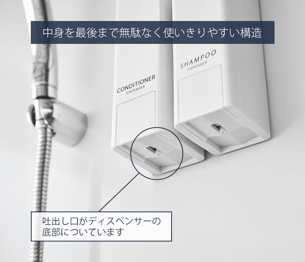 吐出し口がディスペンサーの底についていて、中身を最後まで無駄なく使い切りやすい構造の中身を出す・受け取る動作が片手で完結する、towerの下からでるディスペンサーです。吐出口は底面、プッシュ部分は側面に配置。押しやすい大きなスイッチで、濡れた手でもスムーズに使えます。背面にはマグネット付きで、浴室の壁に取り付け可能。浮かせて設置できるため、ボトル底のぬめりや掃除の手間も軽減します。上部のフタは大きく開き、詰め替えも簡単。容量は使いやすい500ml。「SHAMPOO」「CONDITIONER」「BODY SOAP」の印字入りで、複数使いでも迷わず使え、バスルームに統一感をもたらします。