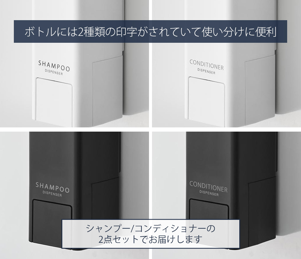 ボトルにはシャンプー(SHAMPOO)/コンディショナー(CONDITIONER)の印字がされているので使い分けに便利です。シャンプー・コンディショナーの2点セットでお届けいたします。