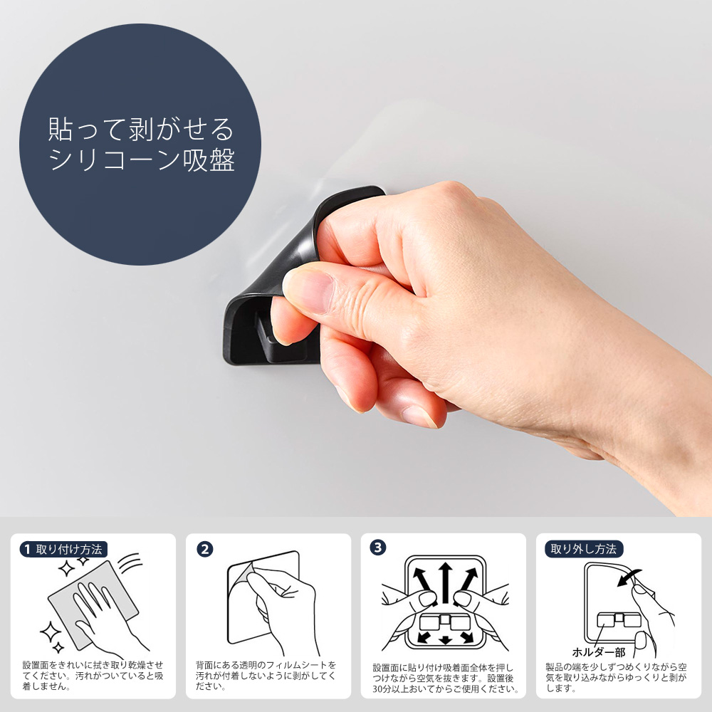 シリコーン吸盤は繰り返し貼って剥がして使用できます。光沢のある平らな油染みしない面であれば取り付けが可能なので、マグネットがつかなかった場所で出来なかった浮かせる収納が実現できます。丸洗いできてお手入れも簡単です。