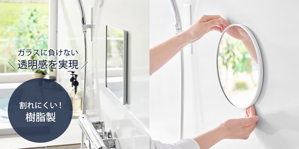 曇り止め加工付きで割れにくい樹脂製バスルームミラー