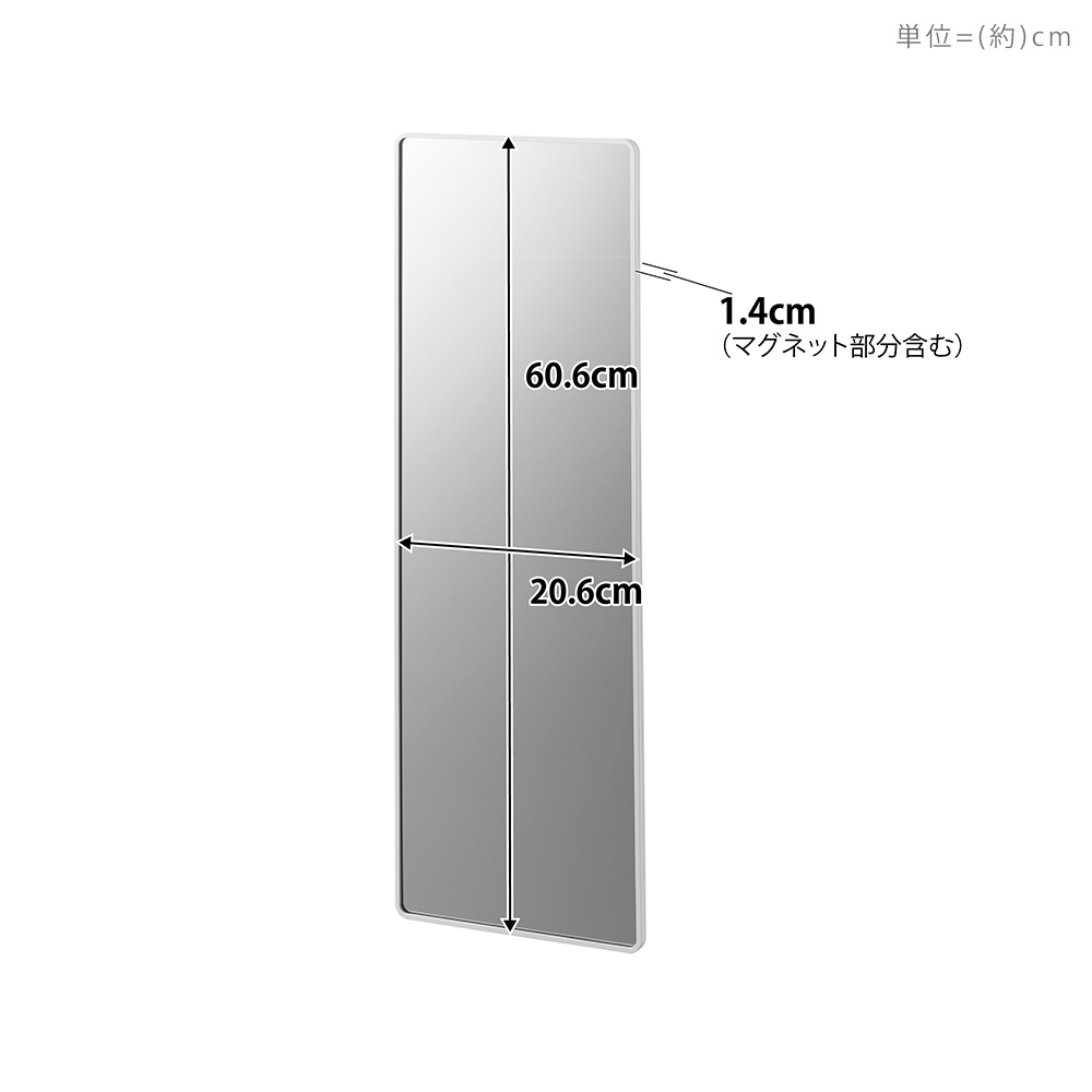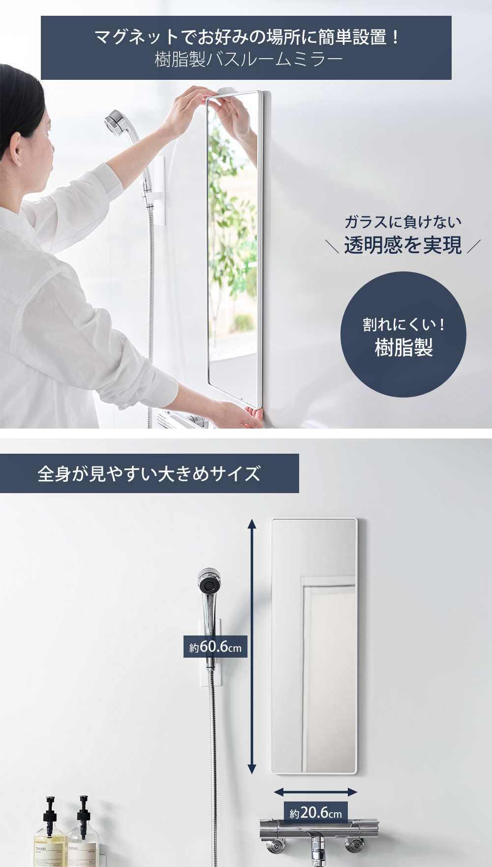 マグネットで簡単に取り付け可能な樹脂製のバスルームミラー。樹脂製なので、落としても割れにくい安全性の高いミラーです。ガラスに負けない透明感を実現し、快適にご使用いただけます。全身が見やすい縦長の大きめサイズです。