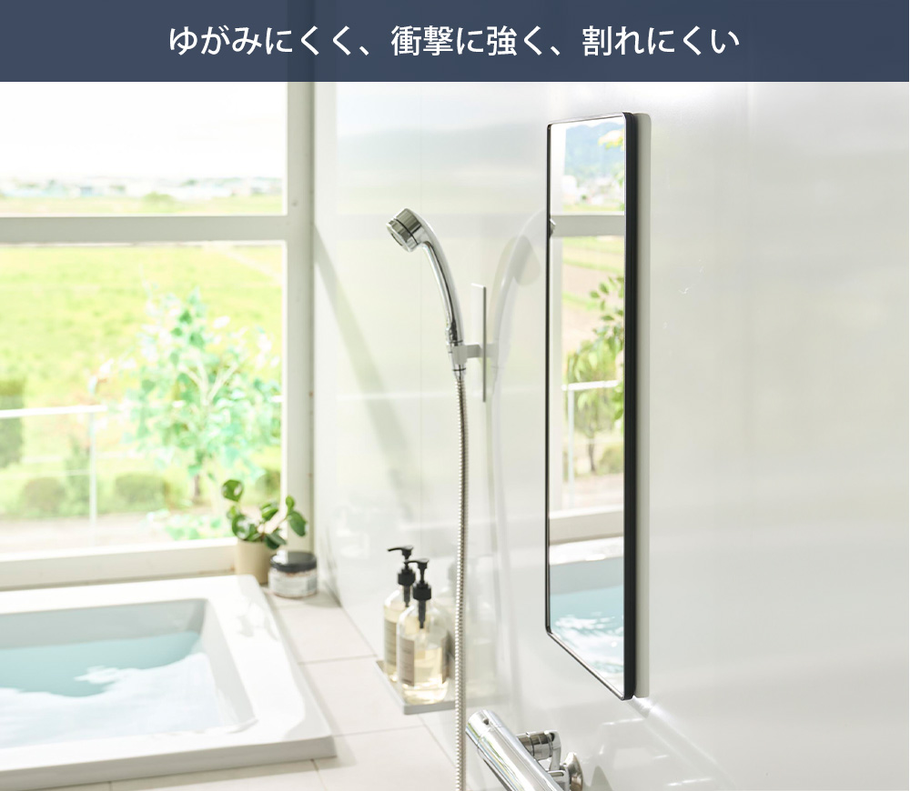 軽くて丈夫な樹脂製ミラーは、衝撃に強く割れにくいのが特長。さらにゆがみが少なく、ガラスミラーに負けない透明感のある映りで快適にご使用いただけます。