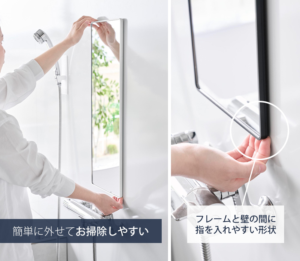 フレームと壁の間に指を入れやすい形状になっており、簡単に外すことができるので、日々のお掃除が楽になります。