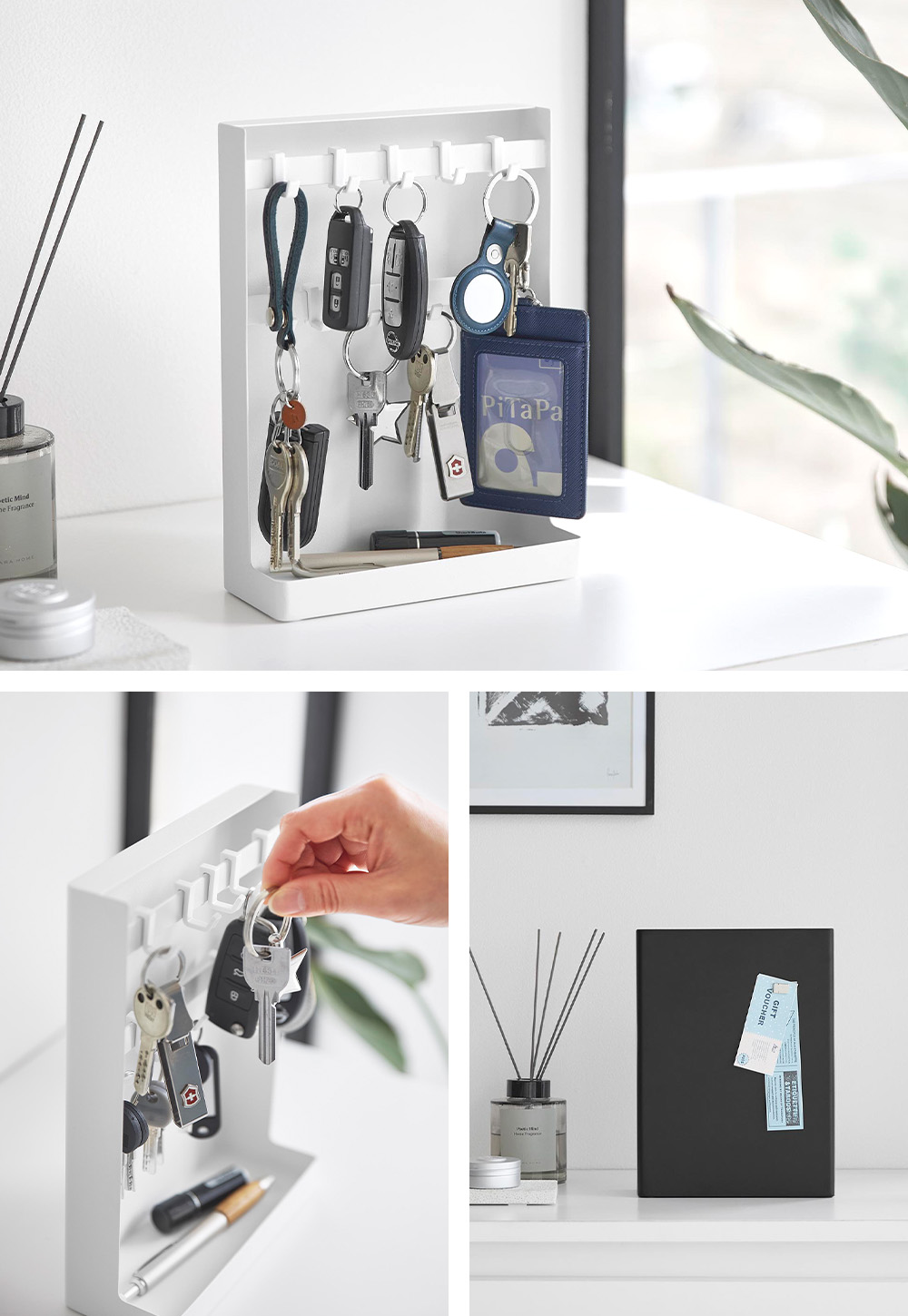 鍵同士が干渉しにくい、奥行違いの2段構造フック。重なりが少ないので、スムーズに取り出すことができます。フックは10個付属しているので、家の鍵、車の鍵、パスケースなどたっぷり収納可能です。さらに下部には、小物を収納できるトレーも付いています。