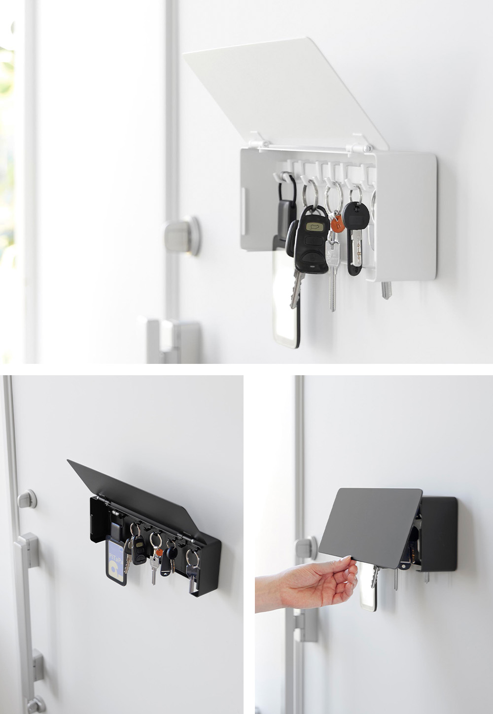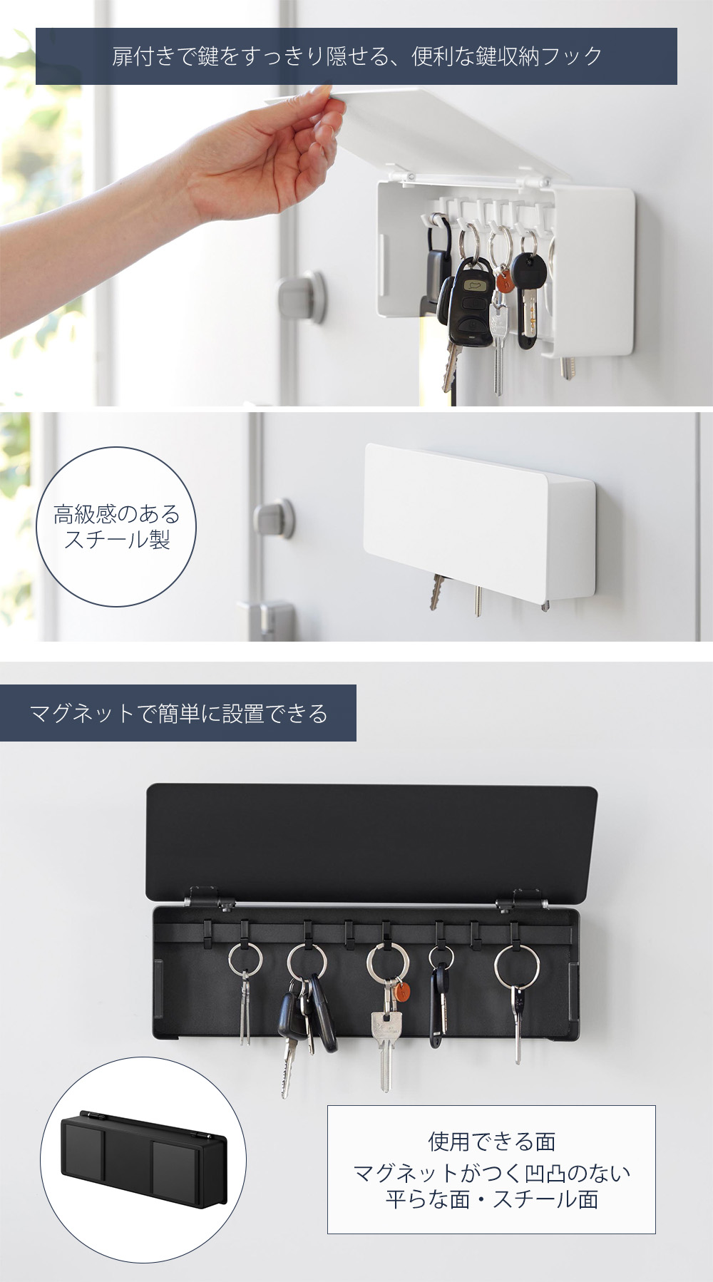 玄関ドアや壁面にマグネットで取り付けて、鍵の定位置にできる鍵収納ボックス。家の鍵、車の鍵、自転車の鍵、カードキーなど、なくしやすい鍵を一括収納できます。高級感のあるスチール製でインテリアに馴染みます。