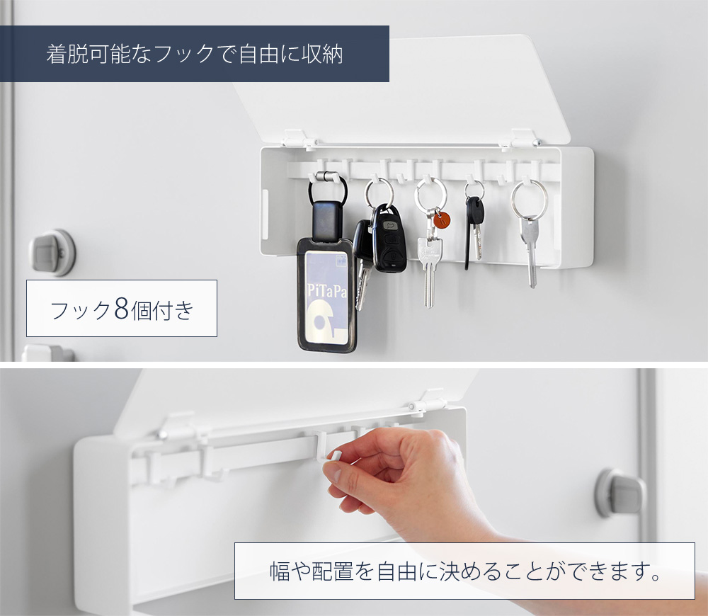着脱可能なフック8個付きで、お好みの位置に自由に配置できます。鍵のサイズに合わせて調節可能です。