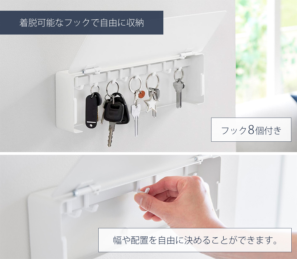 着脱可能なフック8個付きで、お好みの位置に自由に配置できます。鍵のサイズに合わせて調節可能です。