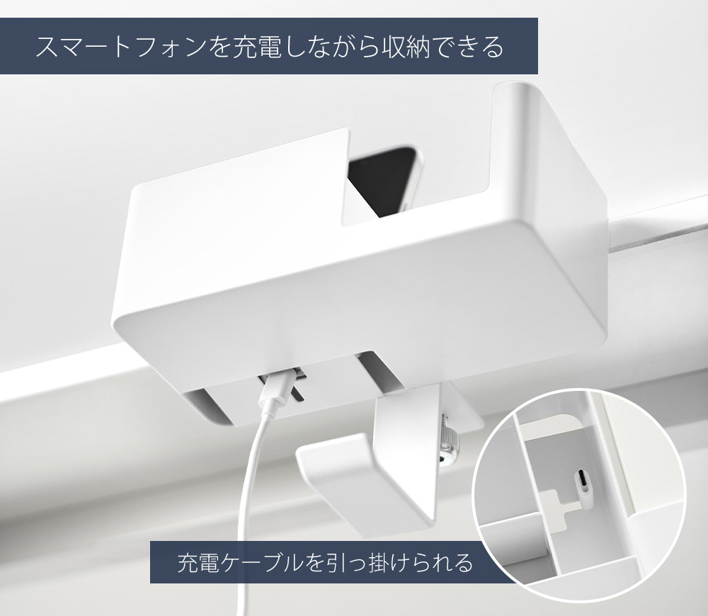 ラックの底面からスマートフォンのケーブルが通せる穴が開いており、充電しながら収納可能です。充電後もケーブルを引っ掛けておくことができるので、部屋にコードが散らばらず次の充電がスムーズになります。