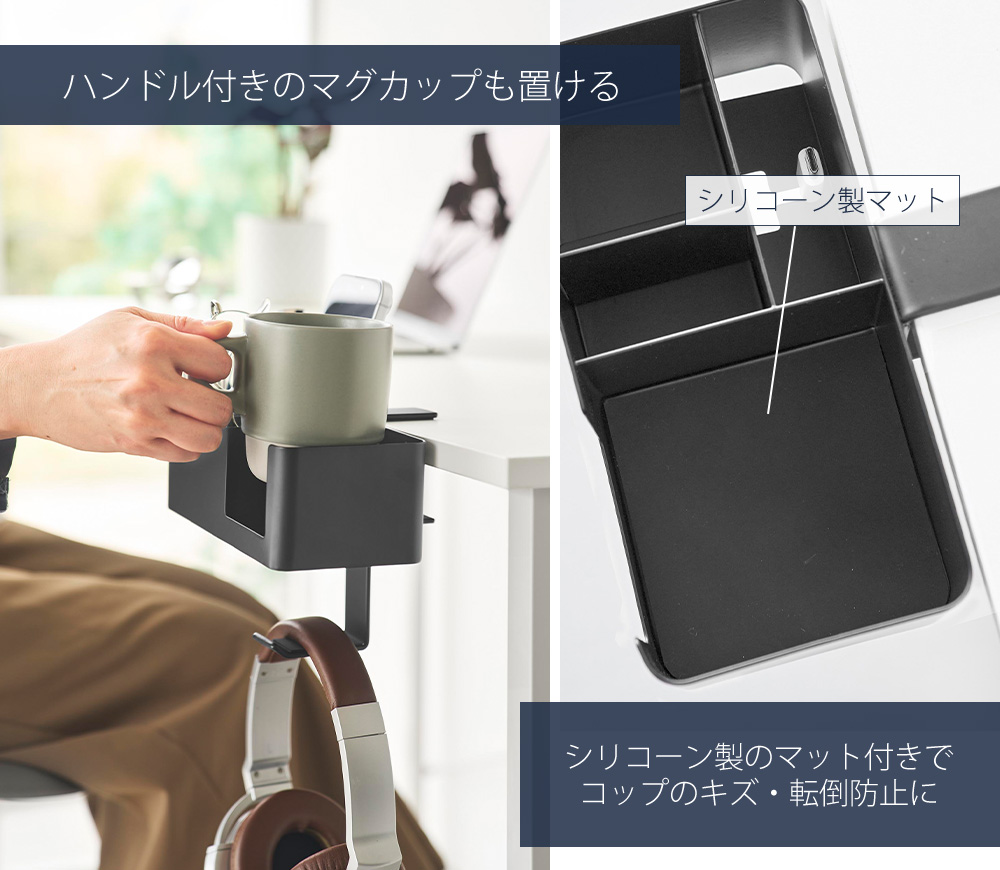 ハンドル付きのマグカップがすっきり収まるデザイン。シリコーン製のマット付きで、コップのキズ・転倒を防ぎます。