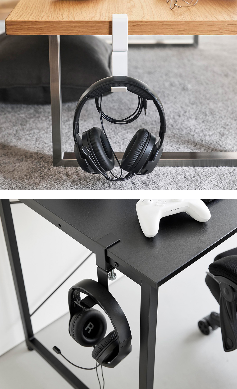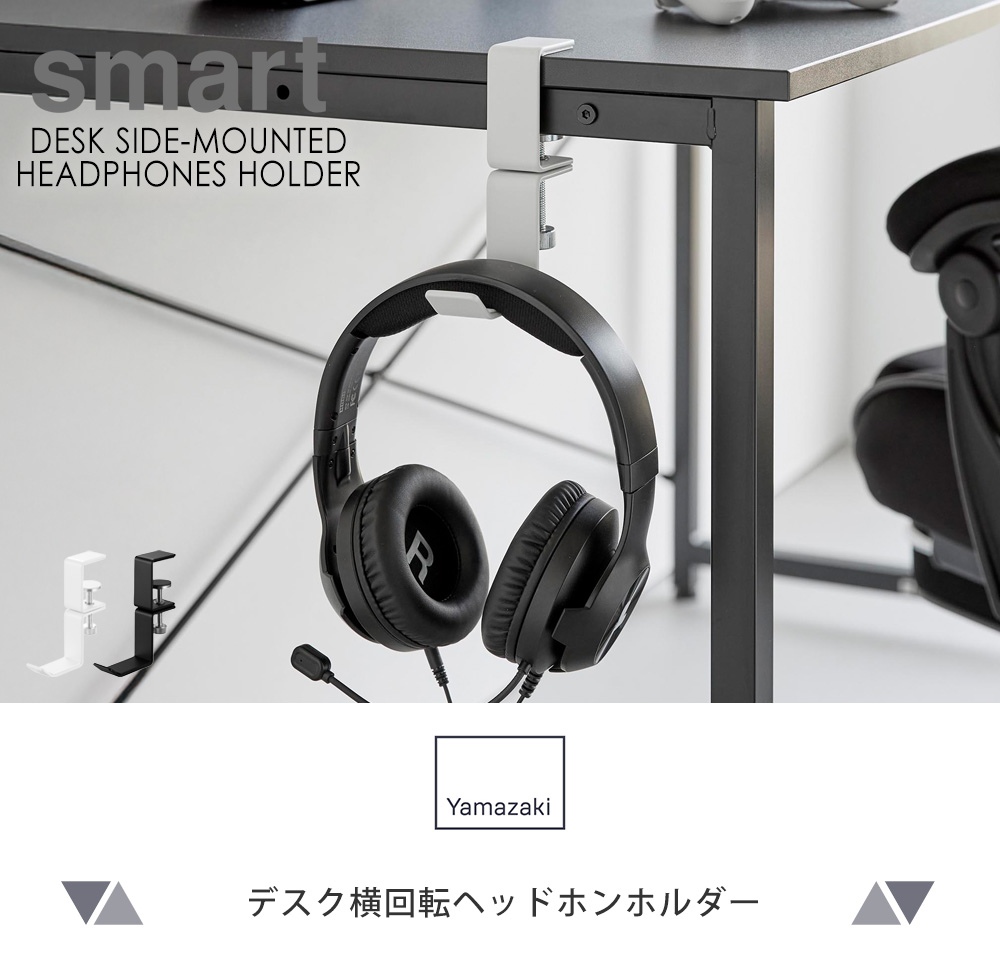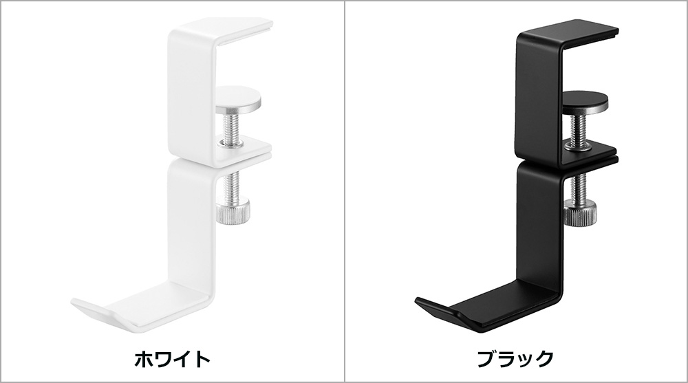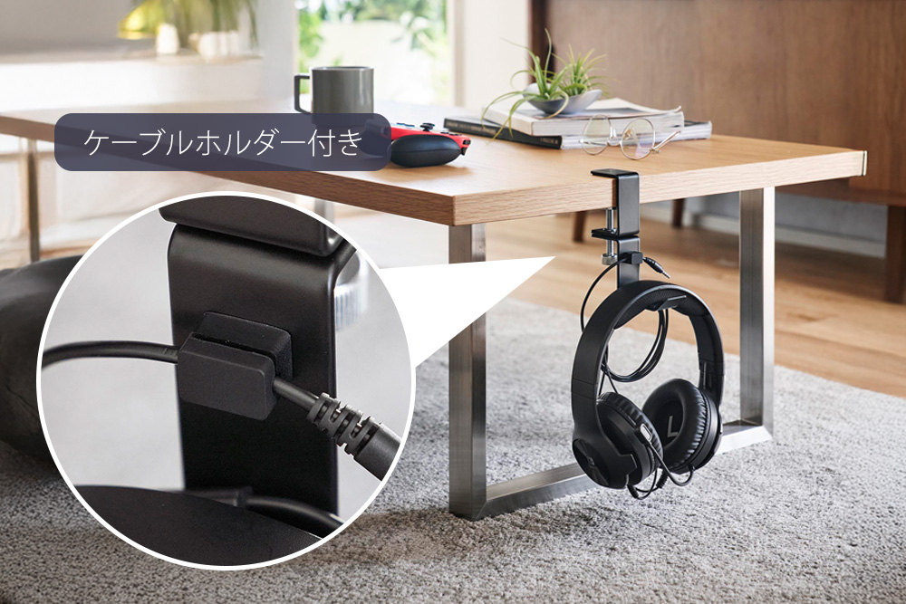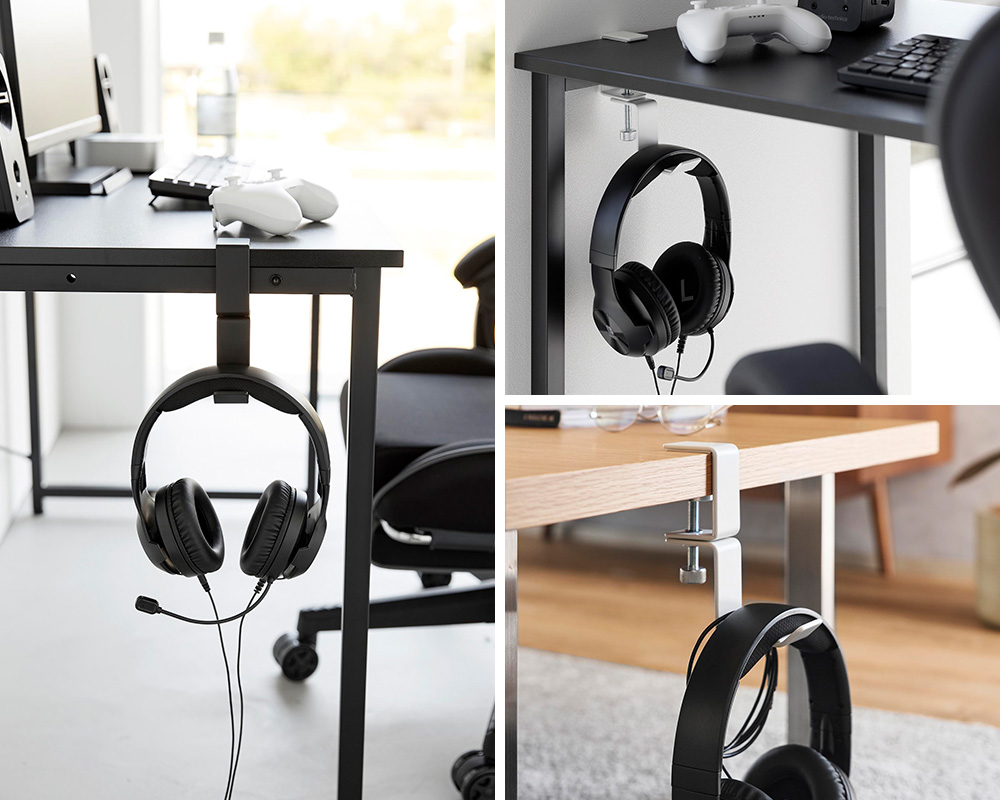 サッと手を伸ばしやすいデスク横やテーブル横に取り付けて、ヘッドホンを収納できるホルダーです。