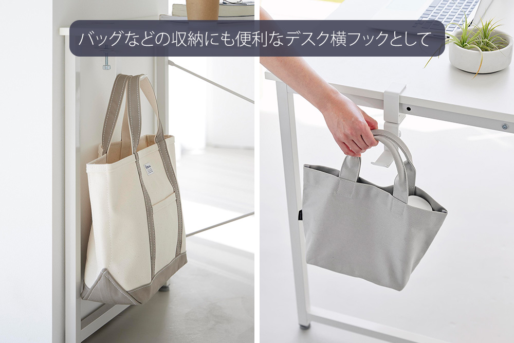 デスク横に取り付けられる引っ掛けフックとして、バッグなどの収納にもオススメです。