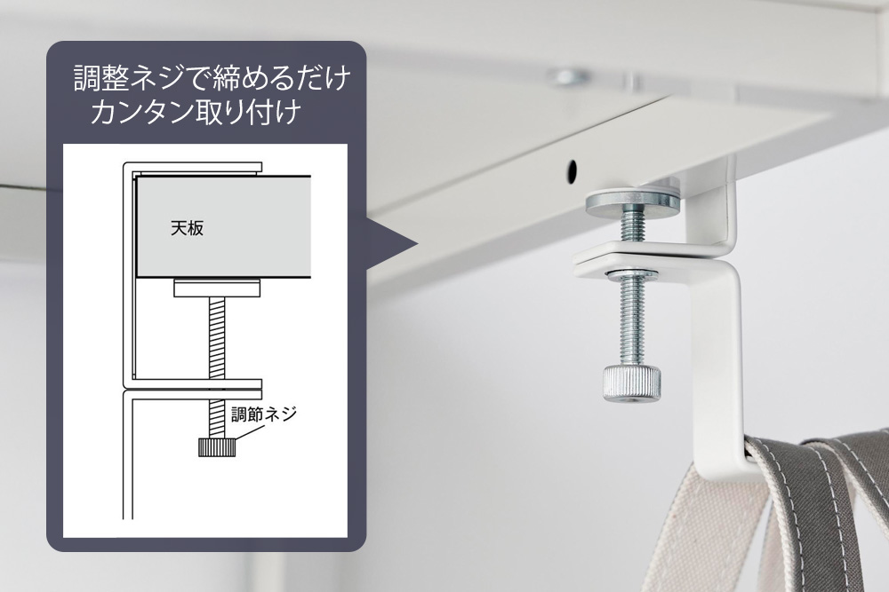付属の調整ネジでデスクの天板にしっかり固定できるクランプ式です。穴開けなどの特殊な作業不要です。